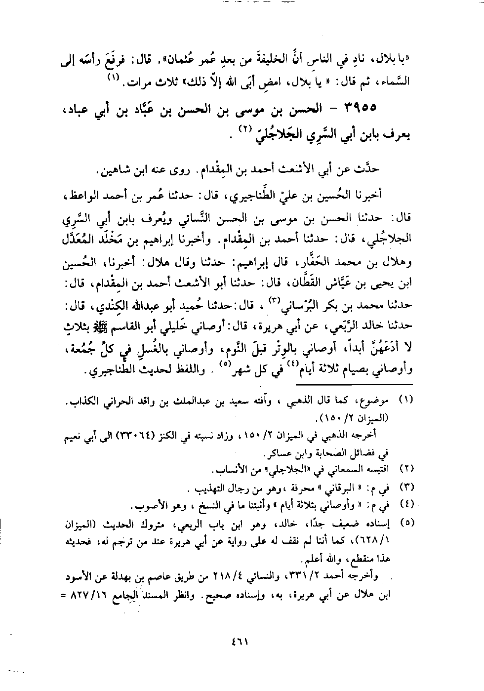 (2526) -[8: 461] أَخْبَرَنَا الْحُسَيْنُ بْنُ عَلِيٍّ الطَّنَاجِيرِيُّ، قَالَ: حَدَّثَنَا عُمَرُ بْنُ أَحْمَدَ الْوَاعِظُ، قَالَ: حَدَّثَنَا الْحَسَنُ بْنُ مُوسَى بْنِ الْحَسَنِ النَّسَائِيُّ وَيُعْرَفُ بِابْنِ أَبِي السَّرِيِّ الْجُلاجُلِيِّ، قَالَ: حَدَّثَنَا أَحْمَدُ بْنُ الْمِقْدَامِ، وَأَخْبَرَنَا إِبْرَاهِيمُ بْنُ مَخْلَدٍ الْمُعَدَّلُ وَهِلالُ بْنُ مُحَمَّدٍ الْحَفَّارُ، قَالَ إِبْرَاهِيمُ: حَدَّثَنَا، وَقَالَ هِلالٌ أَخْبَرَنَا الْحُسَيْنُ بْنُ يَحْيَى بْنِ عَيَّاشٍ الْقَطَّانُ، قَالَ: حَدَّثَنَا أَبُو الأَشْعَثِ أَحْمَدُ بْنُ الْمِقْدَامِ، قَالَ: حَدَّثَنَا مُحَمَّدُ بْنُ بَكْرٍ الْبُرْسَانِيُّ، قَالَ: حَدَّثَنَا حُمَيْدٌ أَبُو عَبْدِ اللَّهِ الْكِنْدِيُّ، قَالَ: حَدَّثَنَا خَالِدٌ الرَّبَعِيُّ، عَنْ أَبِي هُرَيْرَةَ، قَالَ: " أَوْصَانِي خَلِيلِي أَبُو الْقَاسِمِ صَلَّى اللَّهُ عَلَيْهِ وَسَلَّمَ بِثَلاثٍ لا أَدَعُهُنَّ أَبَدًا أَوْصَانِي بِالْوِتْرِ قَبْلَ النَّوْمِ، وَأَوْصَانِي بِالْغُسْلِ فِي كُلِّ جُمُعَةٍ، وَأَوْصَانِي بِثَلاثَةِ أَيَّامٍ فِي كُلِّ شَهْرٍ "، وَاللَّفْظُ لِحَدِيثِ الطَّنَاجِيرِيِّ