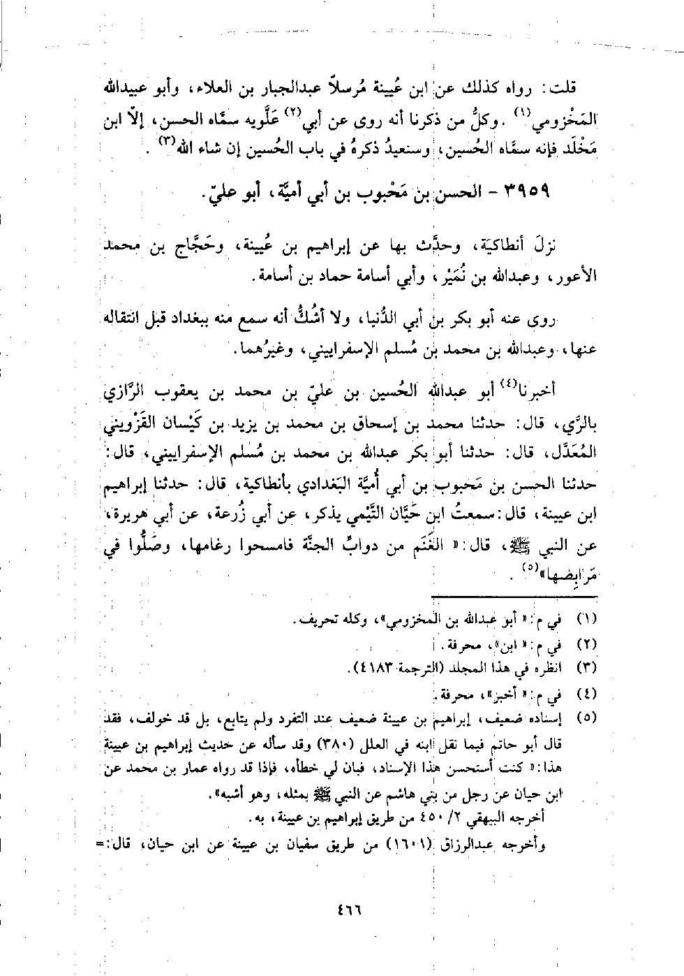 3959 - الْحَسَن بن محبوب بن أَبِي أمية أَبُو عَلِيّ نزل أنطاكية، وحدث بها عَنْ إِبْرَاهِيم بن عيينة، وحجاج بن مُحَمَّد الأعور، وعَبْد اللَّهِ بْن نمير، وأبي أسامة حَمَّاد بن أسامة.