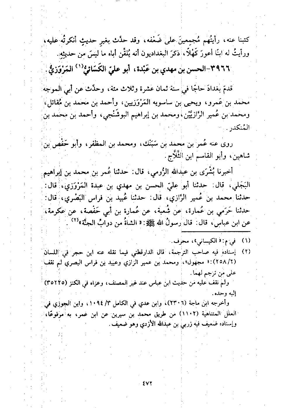 3966 - الْحَسَن بن مهدي بن عبدة أَبُو عَلِيّ الكسائي المروزي قدم بغداد حاجا فِي سنة ثمان عشرة وثلاث مائة، وحدث عَنْ أَبِي الموجه مُحَمَّد بن عمرو، ويحيى بن ساسويه المروزيين، وأحمد بن مُحَمَّدِ بْنِ مقاتل، ومحمد بن عمير الرازيين، ومحمد بن إِبْرَاهِيم البوشنجي، وأحمد بن مُحَمَّدِ بْنِ المنكدر.