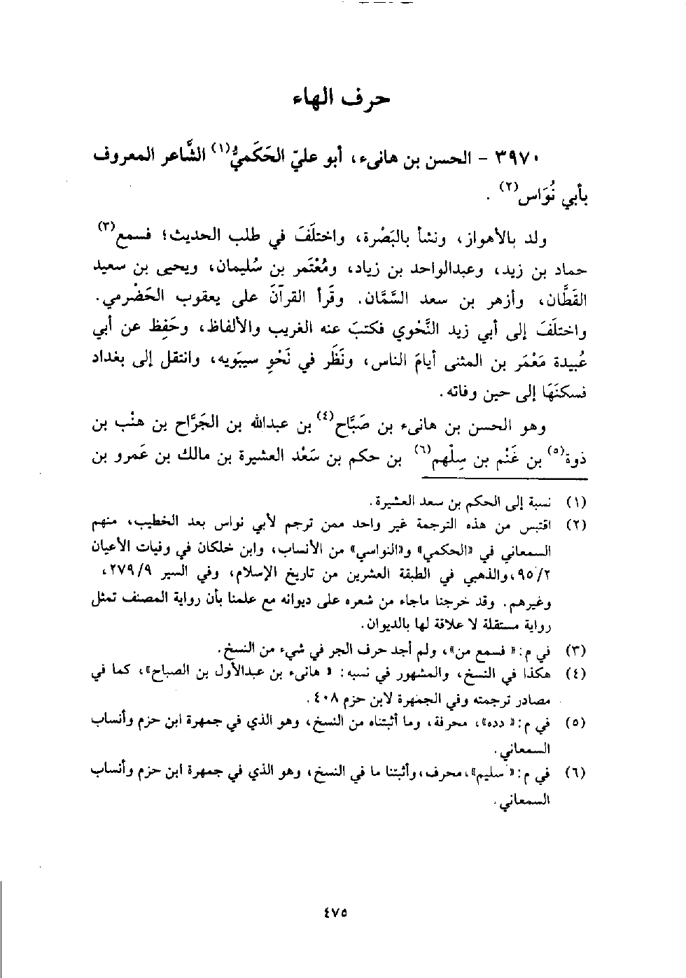 3970 - الْحَسَن بن هانئ أَبُو عَلِيّ الحكمي الشاعر المعروف بأبي نواس ولد بالأهواز، ونشأ بالبصرة، واختلف فِي طلب الحديث، فسمع حَمَّاد بن زيد، وعبد الواحد بن زياد، ومعتمر بن سُلَيْمَان، ويحيى بن سعيد الْقَطَّان، وأزهر بن سعد السمان.