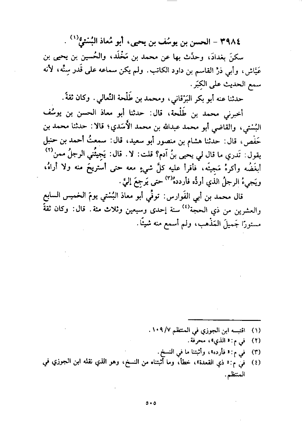 3984 - الْحَسَن بن يوسف بن يَحْيَى أَبُو معاذ البستي سكن بغداد، وحدث بها عَنْ مُحَمَّد بن مخلد، والحسين بن يَحْيَى بن عياش، وأبي ذر الْقَاسِم بن داود الكاتب، ولم يكن سماعه على قدر سنه، لأنه سمع الحديث عَلَى الكبر.