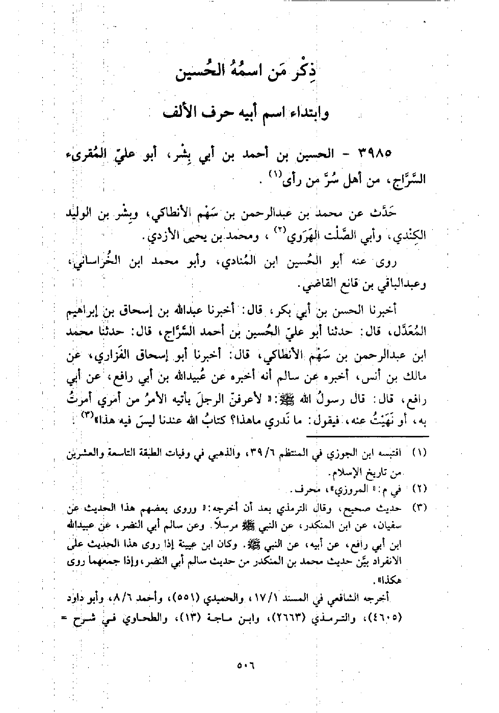 (2551) -[8: 506] أَخْبَرَنَا الْحَسَنُ بْنُ أَبِي بَكْرٍ، قَالَ: أَخْبَرَنَا عَبْدُ اللَّهِ بْنُ إِسْحَاقَ بْنِ إِبْرَاهِيمَ الْمُعَدَّلُ، قَالَ: حَدَّثَنَا أَبُو عَلِيٍّ الْحُسَيْنُ بْنُ أَحْمَدَ السَّرَّاجُ، قَالَ: حَدَّثَنَا مُحَمَّدُ بْنُ عَبْدِ الرَّحْمَنِ بْنِ سَهْمٍ الأَنْطَاكِيُّ، قَالَ: أَخْبَرَنَا أَبُو إِسْحَاقَ الْفَزَارِيُّ، عَنْ مَالِكِ بْنِ أَنَسٍ، أَخْبَرَهُ عَنْ سَالِمٍ، أَنَّهُ أَخْبَرَهُ عَنْ عُبَيْدِ اللَّهِ بْنِ أَبِي رَافِعٍ، عَنْ أَبِي رَافِعٍ، قَالَ: قَالَ رَسُولُ اللَّهِ صَلَّى اللَّهُ عَلَيْهِ وَسَلَّمَ: " لأَعْرِفَنَّ الرَّجُلَ يَأْتِيهِ الأَمْرُ مِنْ أَمْرِي أَمَرْتُ بِهِ، أَوْ نَهَيْتُ عَنْهُ، فَيَقُولُ: مَا نَدْرِي مَا هَذَا؟ كِتَابُ اللَّهِ عِنْدَنَا لَيْسَ فِيهِ هَذَا " أَخْبَرَنَا مُحَمَّدُ بْنُ عبد الواحد، قَالَ: حَدَّثَنَا مُحَمَّدُ بْنُ الْعَبَّاس، قَالَ: قرئ عَلَى ابن المنادي، وأنا أسمع، قَالَ: وأبو عَلِيّ الْحُسَيْن بن أَبِي بشر السراج الْمُقْرِئ توفي بسر من رأى، وبها كَانَ منزله فِي الحرامية، مات ليلة عرفة يعني من سنة تسعين ومائتين ودفن من الغد، وكان من أفاضل الناس، كتب الناس عنه.