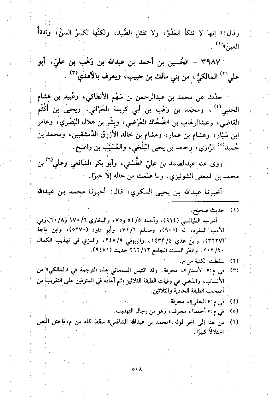 3987 - الْحُسَيْن بن أَحْمَدَ بْنِ عَبْد اللَّهِ بْن وهب بن عَلِيّ أَبُو عَلِيّ المالكي من بني مالك بن حبيب، ويعرف بالآمدي