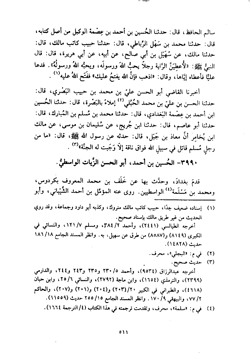 3990 - الْحُسَيْن بن أَحْمَد أَبُو الْحَسَن الزيات الواسطي قدم بغداد، وحدث بها عَنْ خلف بن مُحَمَّد المعروف بكردوس، ومحمد بن مسلمة الواسطيين.