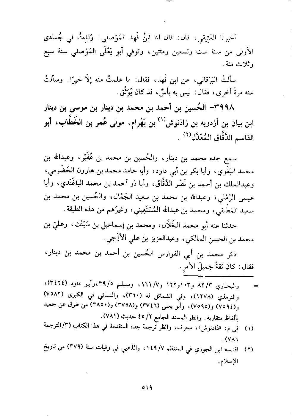3998 - الْحُسَيْن بن أَحْمَدَ بْنِ مُحَمَّد بن دينار بن مُوسَى بن دينار بن بيان بن أزدويه بن زاذنوش بن بهرام مولى عُمَر بن الخطاب رضى اللَّه عنه أَبُو الْقَاسِمِ الدَّقَّاق الْمُعَدَّل