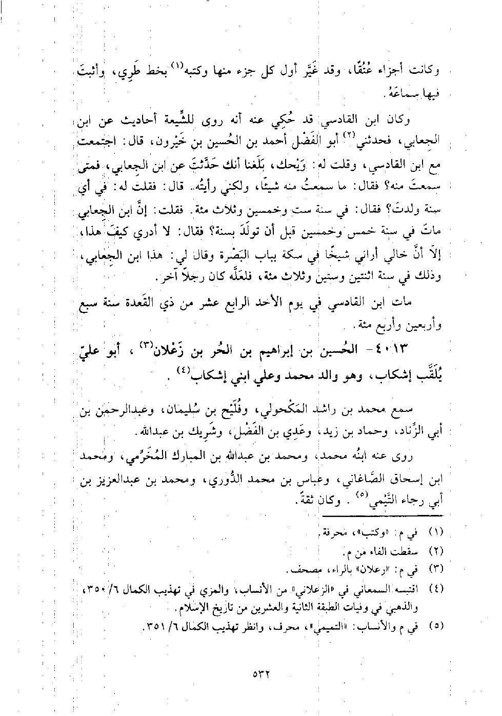 4013 - الْحُسَيْن بن إِبْرَاهِيم بن الحر بن زعلان أَبُو عَلِيّ يلقب إشكاب وهو والد مُحَمَّد وعلي ابني إشكاب