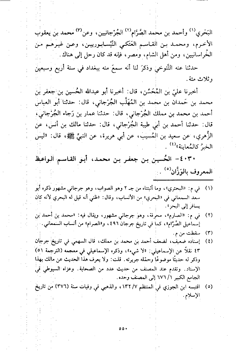 4030 - الْحُسَيْن بن جَعْفَر بن مُحَمَّد أَبُو الْقَاسِمِ الْوَاعِظ المعروف بالوزان سمع أبا الْقَاسِم البغوي، ومحمد بن هَارُون الحضرمي، وأبا عُمَر مُحَمَّد بن يوسف الْقَاضِي، وأبا بكر بن أَبِي داود، ويحيى بن مُحَمَّدِ بْنِ صاعد، وأحمد بن مُحَمَّدِ بْنِ الجراح، وأحمد بن عَبْد اللَّهِ صاحب أَبِي صخرة، وأبا بكر النَّيْسَابُورِيّ، والقاضي المحاملي، وعبد الغافر بن سلامة الحمصي، وأبا الْعَبَّاس بن عقدة.