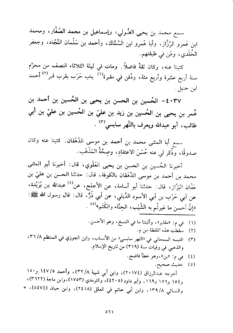 4037 - الْحُسَيْن بن الْحَسَن بن يَحْيَى بن الْحُسَيْن بن أَحْمَدَ بْنِ عُمَر بن يَحْيَى بن الْحُسَيْن بن زيد بن عَلِيّ بن الْحُسَيْن بن عَلِيّ بن أَبِي طالب رضي الله عنه أَبُو عَبْدِ اللَّهِ ويعرف بالنهر سابسي