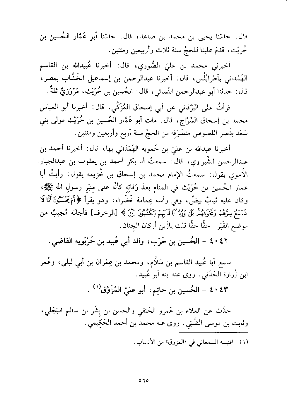 4042 - الْحُسَيْن بن حرب، والد أَبِي عبيد بن حربويه الْقَاضِي سمع أبا عبيد الْقَاسِم بن سلام، ومحمد بن عمران بن أَبِي ليلى، وعمر بن زرارة الحدثي.
