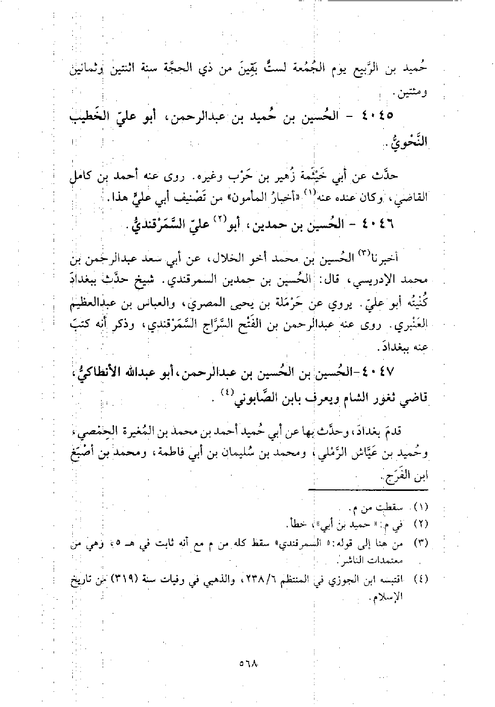 4045 - الْحُسَيْن بن حميد بن عَبْد الرَّحْمَنِ أَبُو عَلِيّ الخطيب النحوي حدث عَنْ أَبِي خيثمة زهير بن حرب، وغيره.