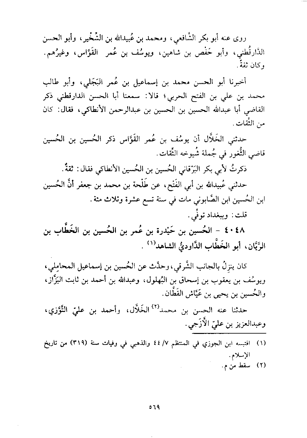 4048 - الْحُسَيْن بن حيدرة بْن عُمَرَ بن الْحُسَيْن بن الخطاب بن الريان أَبُو الخطاب الداودي الشاهد كَانَ ينزل بالجانب الشرقي، وحدث عَنِ الْحُسَيْن بن إِسْمَاعِيل المحاملي، ويوسف بن يَعْقُوبَ بن إِسْحَاق بن البهلول، وعَبْد اللَّهِ بْن أَحْمَدَ بْنِ ثابت البزاز، والحسين بن يَحْيَى بن عياش الْقَطَّان.