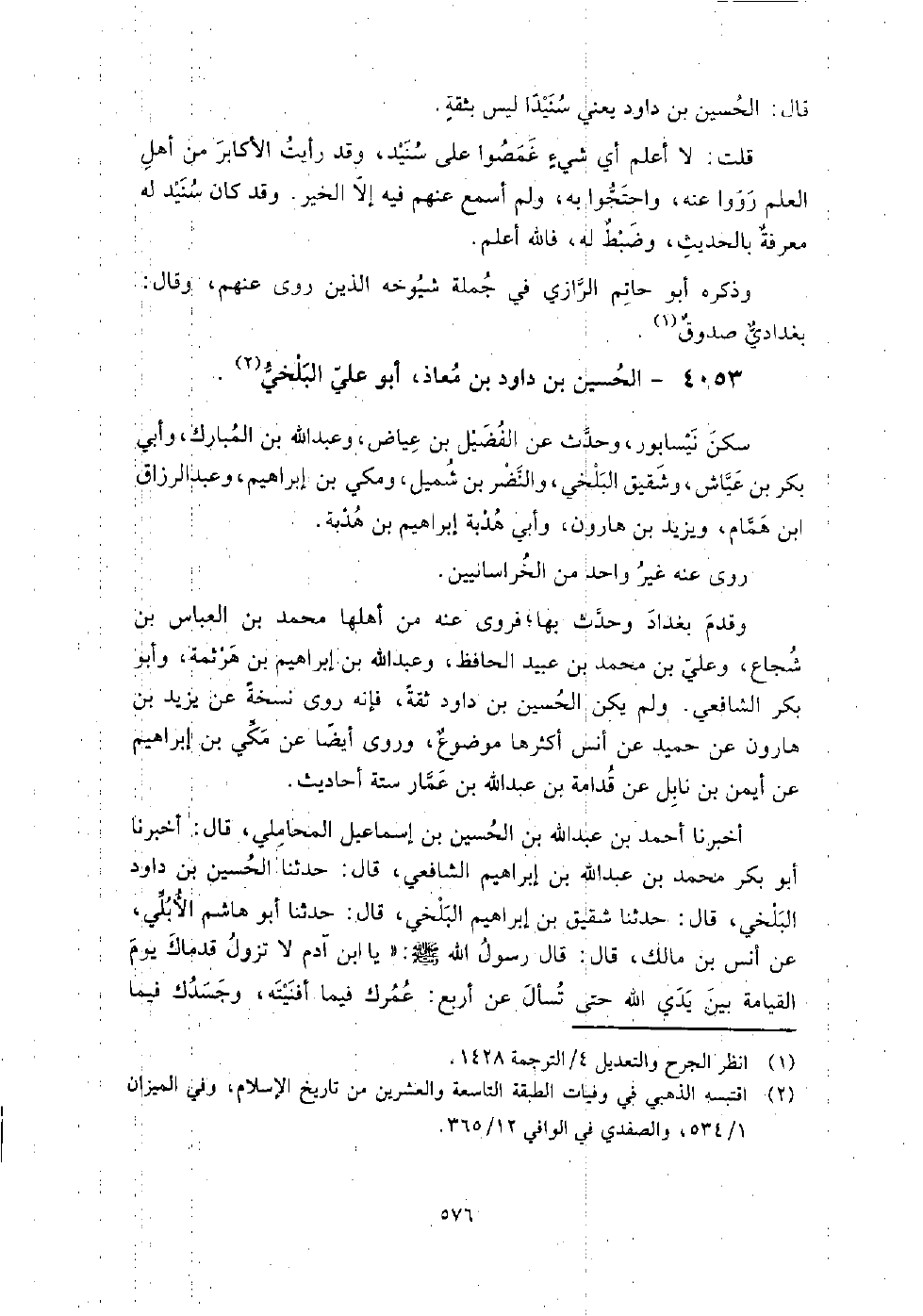 4053 - الْحُسَيْن بن داود بن معاذ أَبُو عَلِيّ البلخي سكن نيسابور، وحدث عَنِ الفضيل بن عياض، وعَبْد اللَّهِ بْن المبارك، وأبي بكر بن عياش، وشقيق البلخي، والنضر بن شميل، ومكي بن إِبْرَاهِيم، وعَبْد الرَّزَّاقِ بن همام، ويزيد بن هَارُون، وأبي هدبة إِبْرَاهِيم بن هدبة.