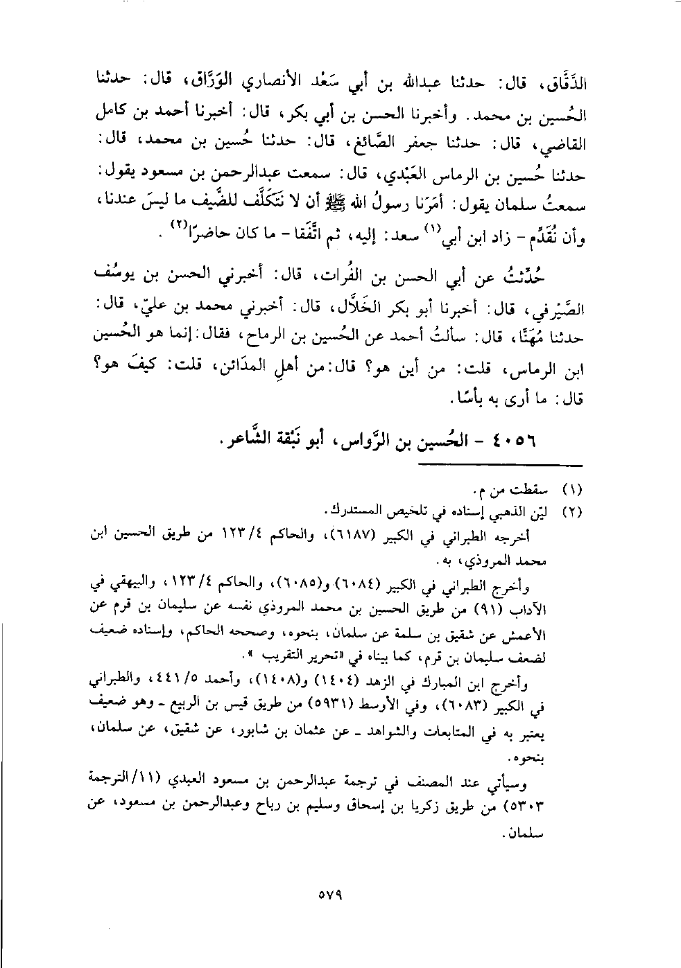 4056 - الْحُسَيْن بن الرواس أَبُو نبقة الشاعر قرأت عَلَى الْحَسَن بن عَلِيّ الجوهري، عَنْ أَبِي عُبَيْد اللَّهِ المرزباني، قَالَ: حَدَّثَنِي مُحَمَّد بن إِبْرَاهِيم، قَالَ: حَدَّثَنَا أَحْمَدُ بْنُ أَبِي خيثمة، قَالَ: حَدَّثَنِي دعبل بن عَلِيّ، قَالَ: كَانَ أَبُو هشام الباهلي يهجو روح بن حاتم بن قبيصة بن المهلب، فبينا هو يعبر الجسر عَلَى دجلة بمدينة السلام، إذ لقيه أَبُو نبقة واسمه الْحُسَيْن بن الرواس مولى خزاعة، وكان شاعرا متكلما، وعاتبه أَبُو نبقة عَلَى هجائه آل المهلب، ثم تدافعا وتلاطما، فدفع أبو نبقة أبا هشام فرمى به إِلَى دجلة، فعلق بحبل الجسر، وبادر إليه قوم من الملاحين فأخرجوه، وتشبث به أَبُو هشام، وكان عَلَى أحد الجانبين المسيب بن زهير الضبي، وعلى الآخر حمزة بن مالك، أو قَالَ: نصر بن مالك الخزاعي، فأراد الناس أن يرفعوهما إِلَى السلطان، فَقَالَ أَبُو نبقة: ارفعونا إِلَى نصر، أو قَالَ: حمزة، وَقَالَ أَبُو هشام: ارفعونا إِلَى المسيب، ففرق بينهما الناس، فَقَالَ أَبُو نبقة: