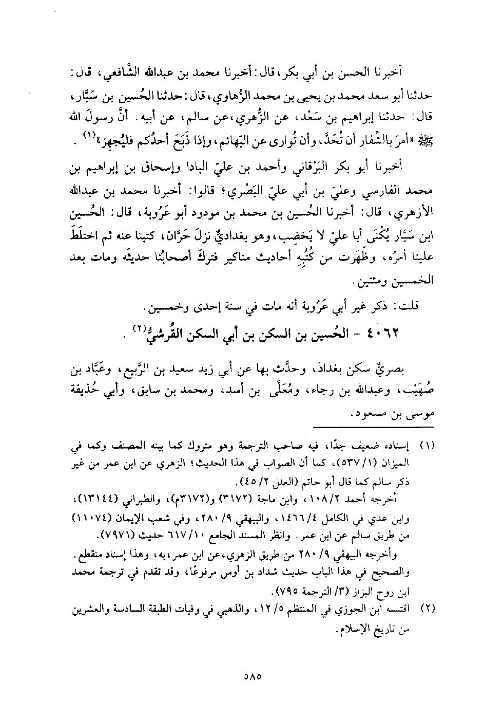 4062 - الْحُسَيْن بن السكن بن أَبِي السكن القرشي بصري سكن بَغْدَاد، وحدث بها عَنْ أَبِي زيد سعيد بن الربيع، وعباد بن صهيب، وعَبْد اللَّهِ بْن رجاء، ومعلى بن أسد، ومحمد بن سابق، وأبي حذيفة مُوسَى بن مسعود.