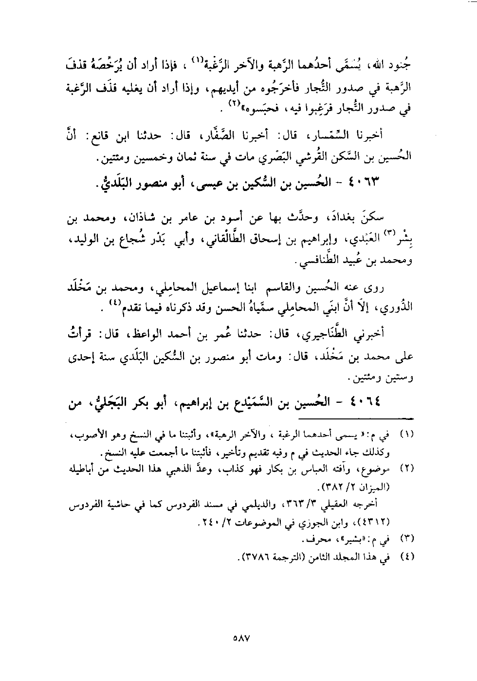 4063 - الْحُسَيْن بن السكين بن عِيسَى أَبُو مَنْصُور البلدي سكن بَغْدَاد، وحدث بها عَنْ أسود بن عامر بن شاذان، ومحمد بن بشر العبدي، وإبراهيم بن إِسْحَاق الطالقاني، وأبي بدر شجاع بن الوليد، ومحمد بن عبيد الطنافسي.