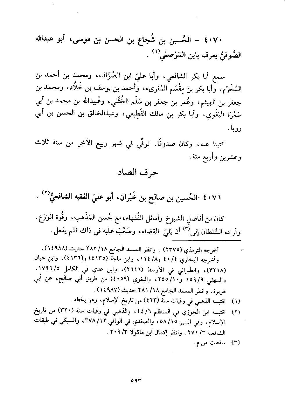 4071 - الْحُسَيْن بن صالح بن خيران أَبُو عَلِيّ الفقيه الشَّافِعِيّ كَانَ من أفاضل الشيوخ وأماثل الفقهاء، مع حسن المذهب، وقوة الورع، وأراده السلطان إِلَى أن يلي القضاء، وصعب عليه فِي ذلك فلم يفعل.