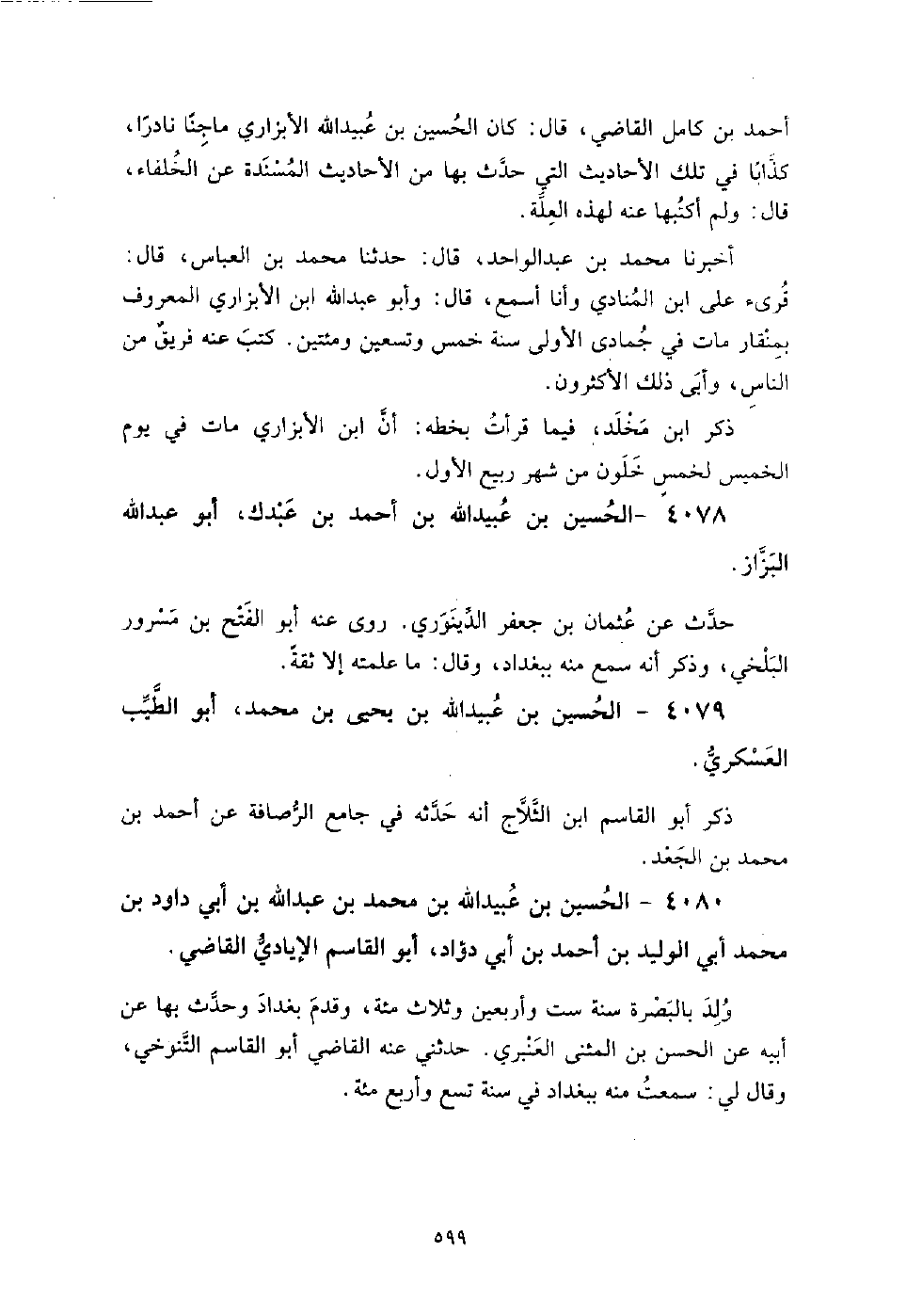 4080 - الْحُسَيْن بن عُبَيْد اللَّهِ بن مُحَمَّدِ بْنِ عَبْد اللَّهِ بْن أَبِي داود بن مُحَمَّد أَبِي الوليد بن أَحْمَدَ بْنِ أَبِي داود أَبُو الْقَاسِمِ الإيادي الْقَاضِي