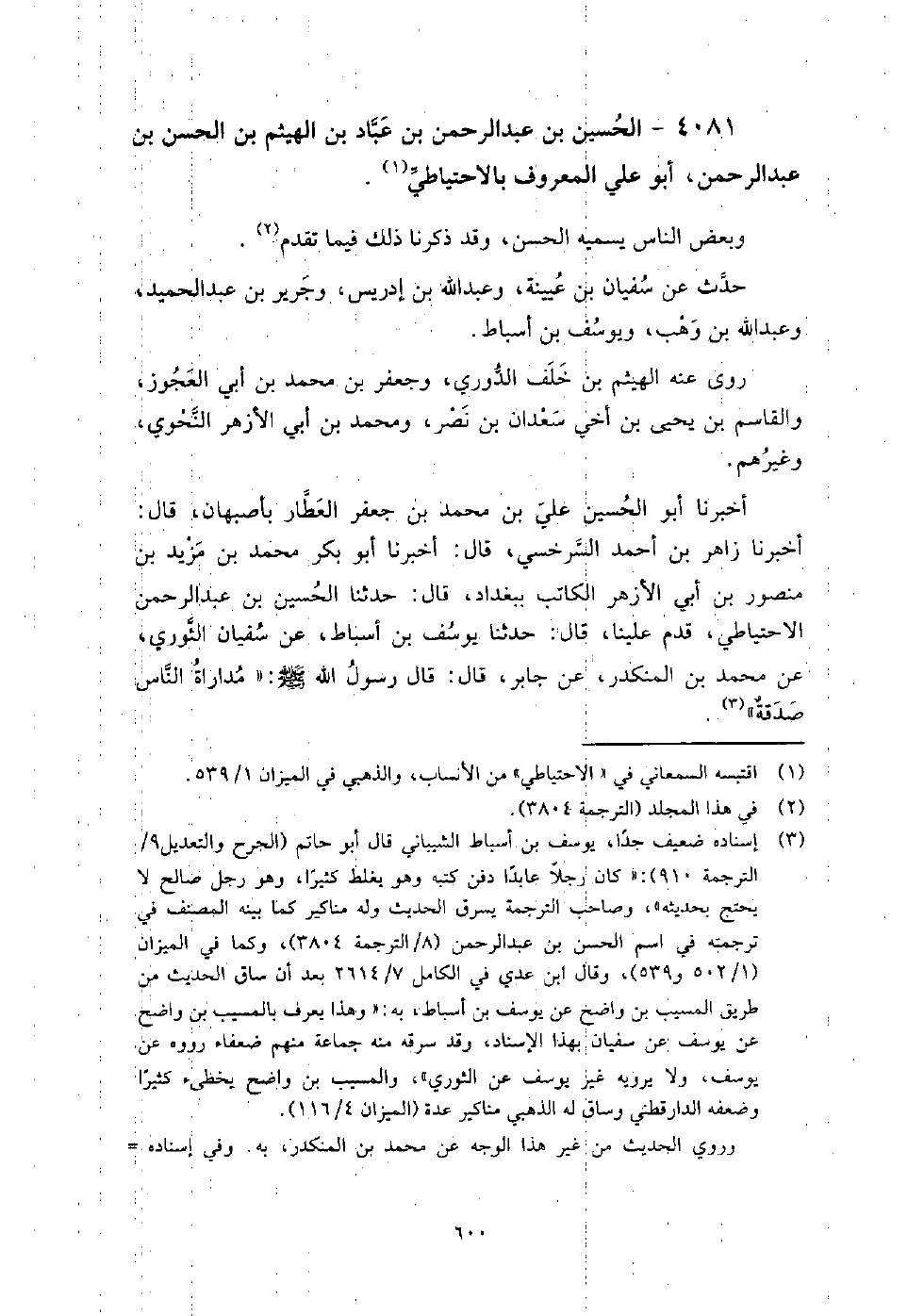 (2603) -[8: 600] أَخْبَرَنَا أَبُو الْحُسَيْنِ عَلِيُّ بْنُ مُحَمَّدِ بْنِ جَعْفَرٍ الْعَطَّارُ، بِأَصْبَهَانَ، قَالَ: أَخْبَرَنَا زَاهِرُ بْنُ أَحْمَدَ السَّرَخْسِيُّ، قَالَ: أَخْبَرَنَا أَبُو بَكْرٍ مُحَمَّدُ بْنُ مَزْيَدِ بْنِ مَنْصُورِ بْنِ أَبِي الأَزْهَرِ الْكَاتِبُ، بِبَغْدَادَ، قَالَ: حَدَّثَنَا الْحُسَيْنُ بْنُ عَبْدِ الرَّحْمَنِ الاحْتِيَاطِيُّ، قَدِمَ عَلَيْنَا، قَالَ: حَدَّثَنَا يُوسُفُ بْنُ أَسْبَاطٍ، عَنْ سُفْيَانَ الثَّوْرِيِّ، عَنْ مُحَمَّدِ بْنِ الْمُنْكَدِرِ، عَنْ جَابِرٍ، قَالَ: قَالَ رَسُولُ اللَّهِ صَلَّى اللَّهُ عَلَيْهِ وَسَلَّمَ: " مُدَارَاةُ النَّاسِ صَدَقَةٌ " حدثت عَنْ أَبِي الْحَسَن بن الفرات، قَالَ: أَخْبَرَنِي الْحَسَن بن يوسف الصيرفي، قَالَ: أَخْبَرَنَا أَبُو بَكْرٍ أَحْمَد بن مُحَمَّدِ بْنِ هَارُون الخلال، قَالَ: أَخْبَرَنَا أَبُو بَكْر المروذي، قَالَ: سألت أبا عَبْد اللَّهِ، يعني أَحْمَد بن حنبل، عَنِ الاحتياطي، قُلْتُ: تعرفه؟ قَالَ: يقال لَهُ حسين أعرفه بالتخليط، وذكر أَنَّهُ دخل مع إنسان فِي شيء من أمر السلطان.