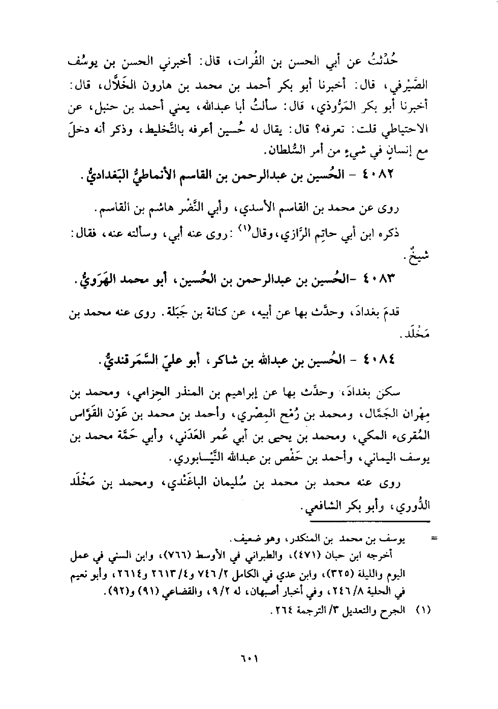 4083 - الْحُسَيْن بن عَبْد الرَّحْمَنِ بن الْحُسَيْن أَبُو مُحَمَّد الهروي قدم بَغْدَاد، وحدث بها عَنْ أَبِيهِ، عَنْ كنانة بن جبلة.