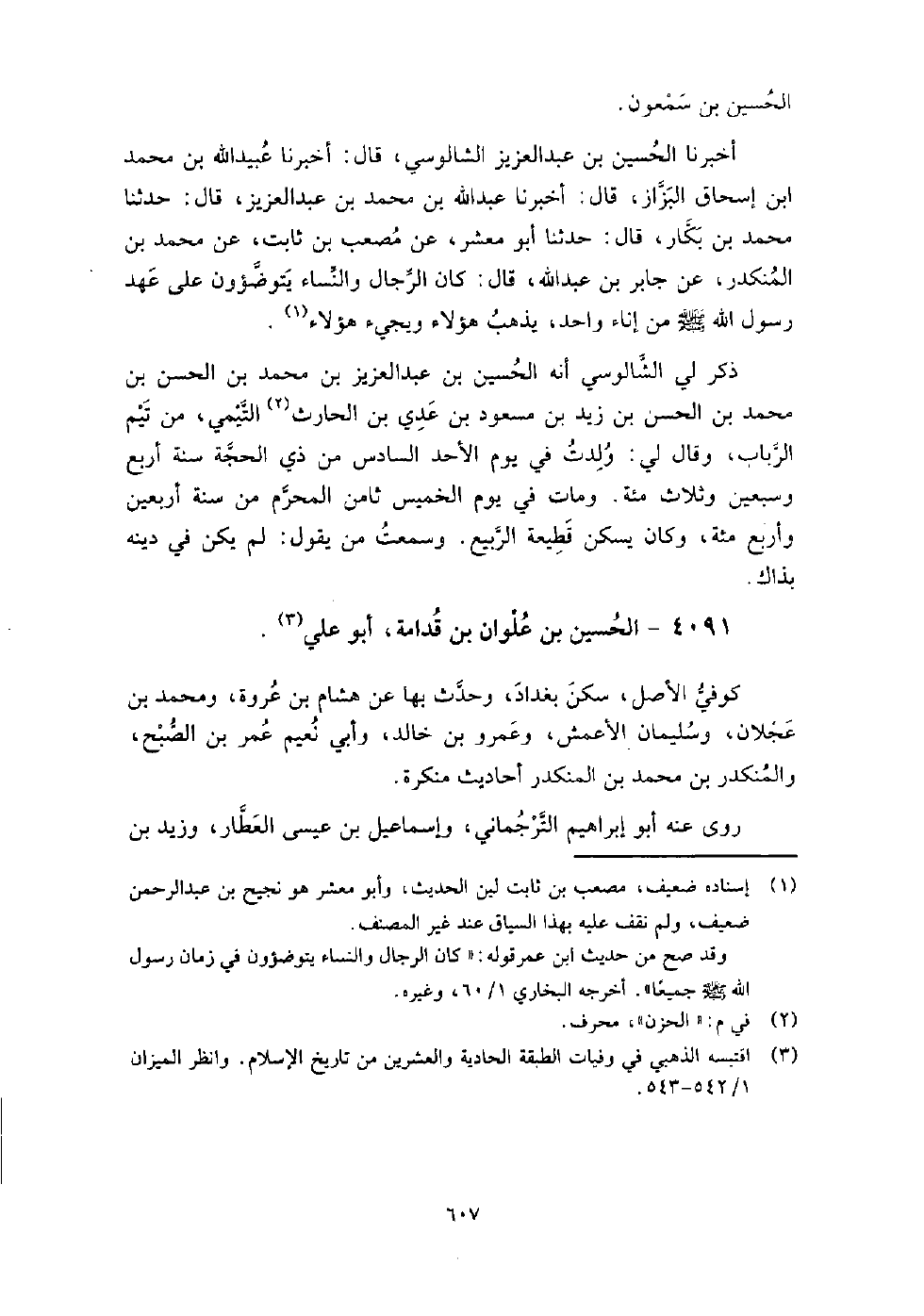 4091 - الْحُسَيْن بن علوان بن قدامة أَبُو عَلِيّ كوفي الأصل، سكن بَغْدَاد، وحدث بها عَنْ هشام بن عروة، ومحمد بن عجلان، وسليمان الأَعْمَش، وعمرو بن خالد، وأبي نعيم عمر بن الصبح، والمنكدر بن محمد بن المنكدر أحاديث منكرة.