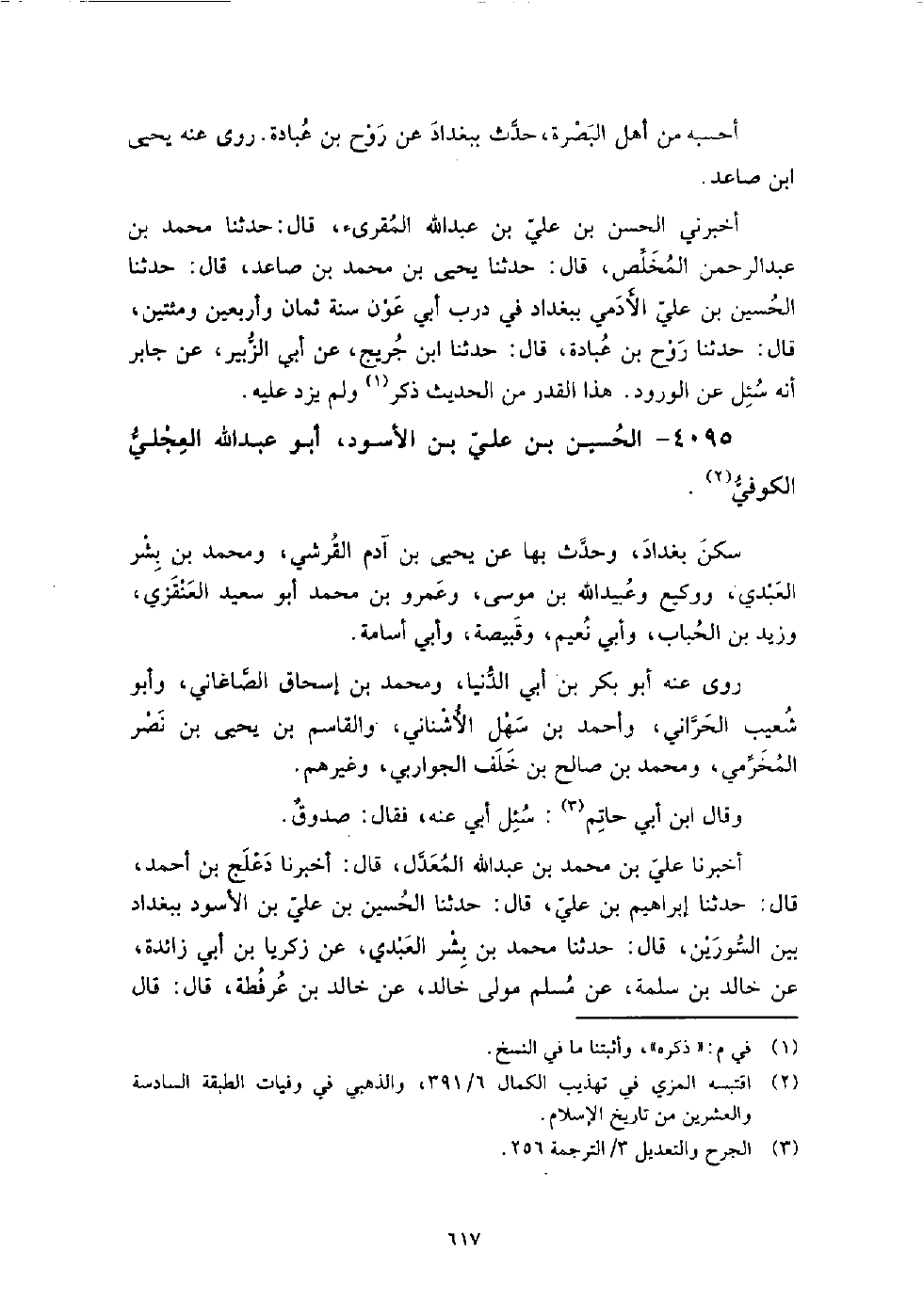 4095 - الْحُسَيْن بن عَلِيّ بن الأسود أَبُو عَبْدِ اللَّهِ العجلي الكوفي سكن بَغْدَاد، وحدث بها عَنْ يَحْيَى بن آدم القرشي، ومحمد بن بشر العبدي، ووكيع، وعُبَيْد اللَّهِ بن مُوسَى، وعمرو بن مُحَمَّد أَبُو سعيد العنقزي، وزيد بن الحباب، وأبي نعيم، وقبيصة، وأبي أسامة.