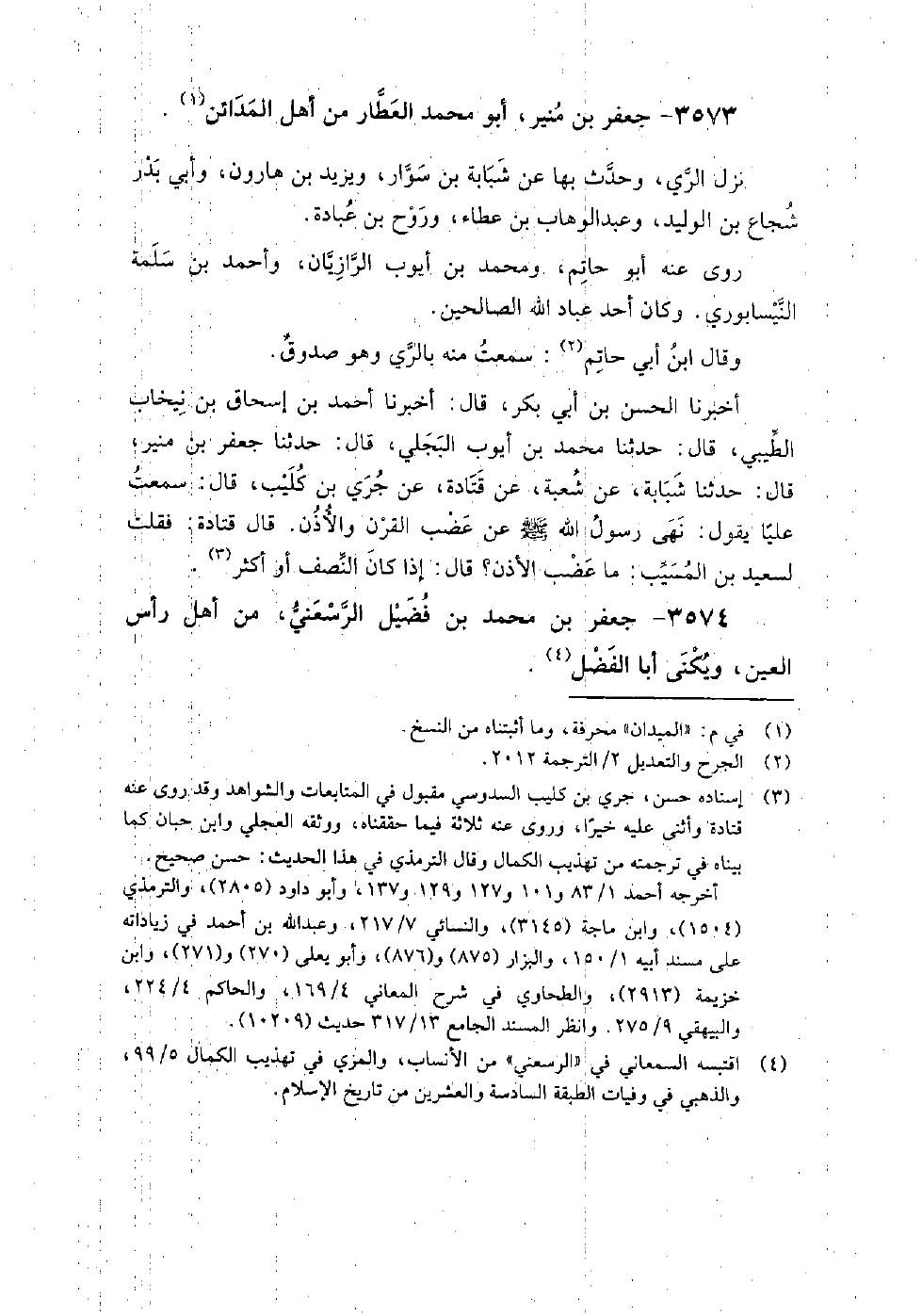 3574 - جعفر بن مُحَمَّدِ بْنِ فضيل الرسعني، من أهل رأس العين، ويكنى أبا الفضل قدم بغداد، وحدث بها عَنْ مُحَمَّد بن حمير الحمصي، وإسحاق بن إِبْرَاهِيم الحنيني، وسعيد بن أبي مريم المصري، وعبد المجيد بن عبد العزيز بن أبي رواد، ومحمد بن سُلَيْمَان بن أبي دؤاد الحراني، ومحمد بن كثير المصيصي، وأبي المغيرة، وعلي بن عياش الحمصيين.