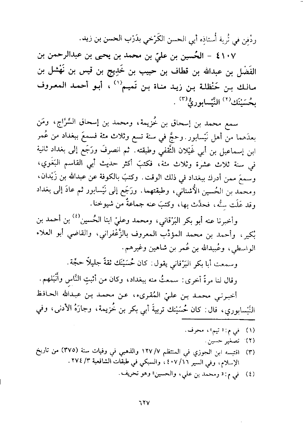 4107 - الْحُسَيْن بن عَلِيّ بن مُحَمَّدِ بْنِ يَحْيَى بن عَبْد الرَّحْمَنِ بن الفضل بن عَبْدِ اللَّهِ بْنِ قطاف بن حبيب بن خديج بن قيس بن نهشل بن مالك بن حنظلة بن زيد مناة بن تميم أَبُو أَحْمَد المعروف بحسينك النَّيْسَابُورِيّ سمع مُحَمَّد بن إِسْحَاق بن خزيمة، ومحمد بن إِسْحَاق السراج، ومن بعدهما من أهل نيسابور، وحج فِي سنة تسع وثلاث مائة، فسمع بِبَغْدَادَ من عُمَر بن إِسْمَاعِيل بن أَبِي غيلان الثقفي وطبقته.