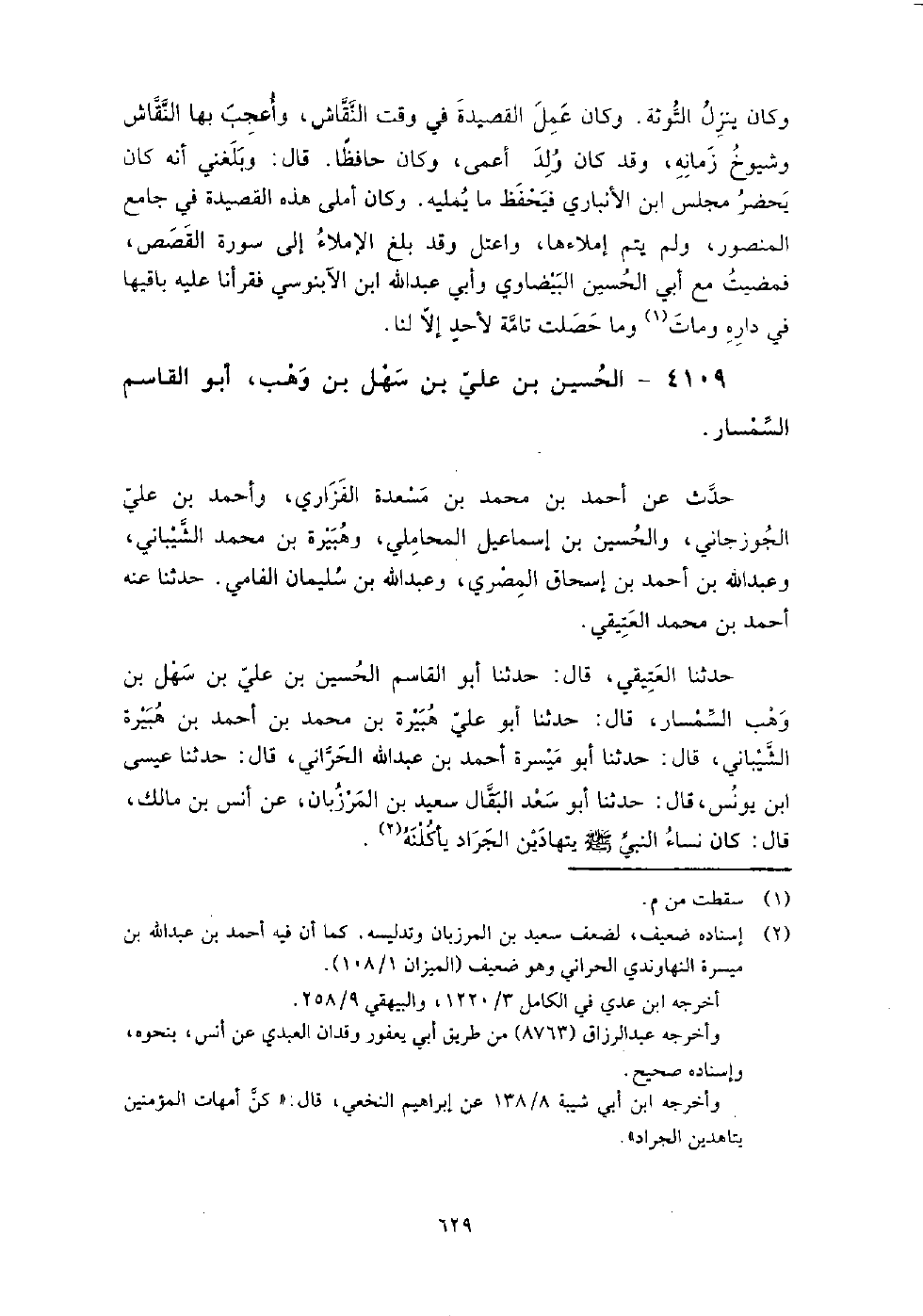 (2622) حَدَّثَنَا الْعَتِيقِيُّ، قَالَ: حَدَّثَنَا أَبُو الْقَاسِمِ الْحُسَيْنُ بْنُ عَلِيِّ بْنِ سَهْلِ بْنِ وَهْبٍ السِّمْسَارُ، قَالَ: حَدَّثَنَا أَبُو عَلِيٍّ هُبَيْرَةُ بْنُ مُحَمَّدِ بْنِ أَحْمَدَ بْنِ هُبَيْرَةَ الشَّيْبَانِيُّ، قَالَ: حَدَّثَنَا أَبُو مَيْسَرَةَ أَحْمَدُ بْنُ عَبْدِ اللَّهِ الْحَرَّانِيُّ، قَالَ: حَدَّثَنَا عِيسَى بْنُ يُونُسَ، قَالَ: حَدَّثَنَا أَبُو سَعْدٍ الْبَقَّالُ سَعِيدُ بْنُ الْمَرْزُبَانِ، عَنْ أَنَسِ بْنِ مَالِكٍ، قَالَ: " كَانَ نِسَاءُ النَّبِيِّ صَلَّى اللَّهُ عَلَيْهِ وَسَلَّمَ يَتَهَادَيْنَ الْجَرَادَ يَأْكُلْنَهُ " سألت عنه العتيقي، فَقَالَ: كَانَ ثِقَةً يسكن الحربية.