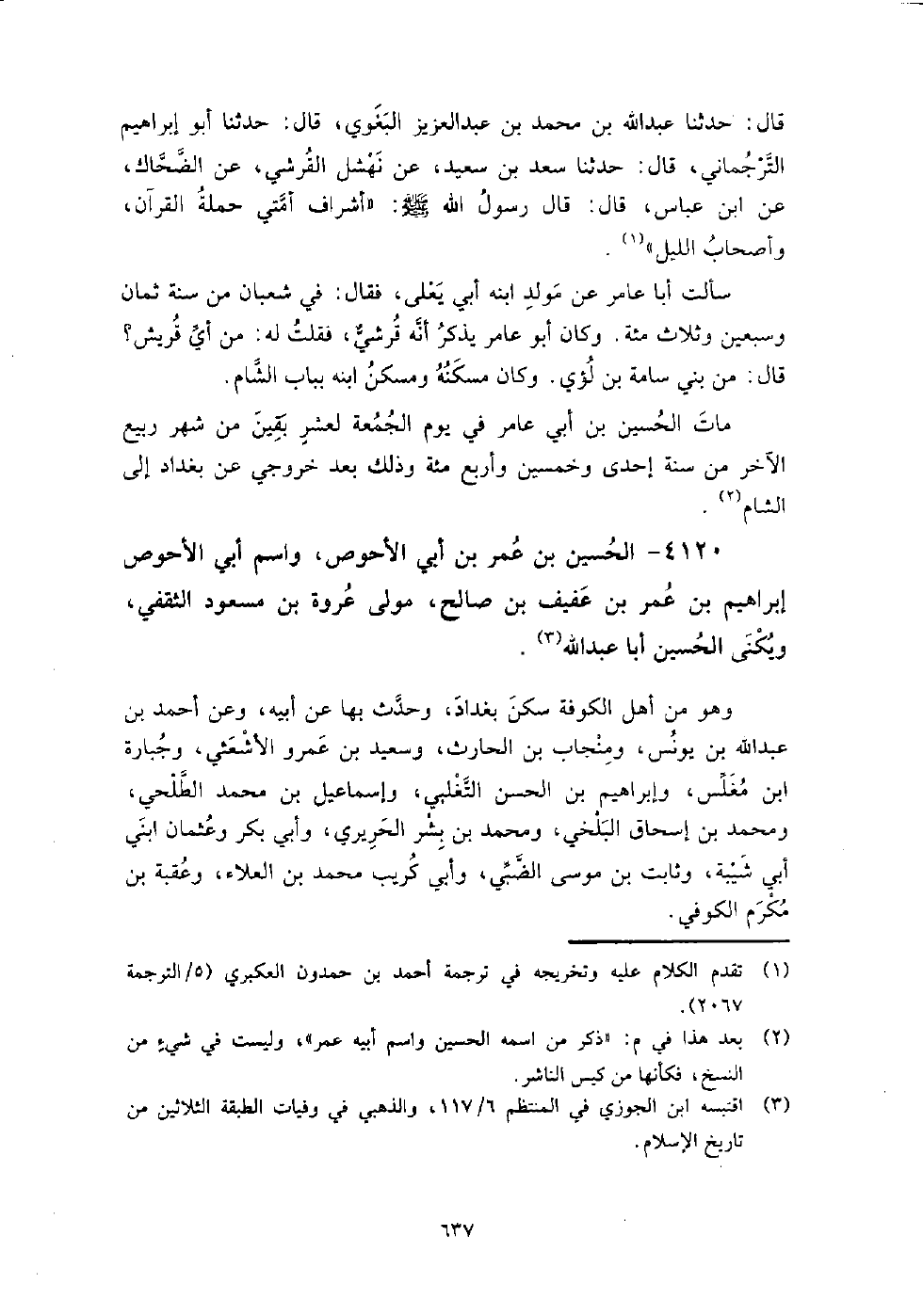 4120 - الْحُسَيْن بْن عُمَرَ بن أَبِي الأحوص، واسم أَبِي الأحوص إِبْرَاهِيم بْن عُمَرَ بن عفيف بن صالح مولى عروة بن مسعود الثقفي ويكنى الْحُسَيْن أبا عَبْد اللَّهِ وهو من أهل الكوفة سكن بَغْدَاد، وحدث بها عَنْ أَبِيهِ، وعن أَحْمَد بن عَبْدِ اللَّهِ بْنِ يونس، ومنجاب بن الحارث، وسعيد بن عمرو الأشعثي، وجبارة بن مغلس، وإبراهيم بن الْحَسَن التغلبي، وإسماعيل بن مُحَمَّد الطلحي، ومحمد بن إِسْحَاق البلخي، ومحمد بن بشر الحريري، وأبي بكر، وعثمان ابني أَبِي شيبة، وثابت بن مُوسَى الضبي، وأبي كريب مُحَمَّد بن العلاء، وعقبة بن مكرم الكوفي.
