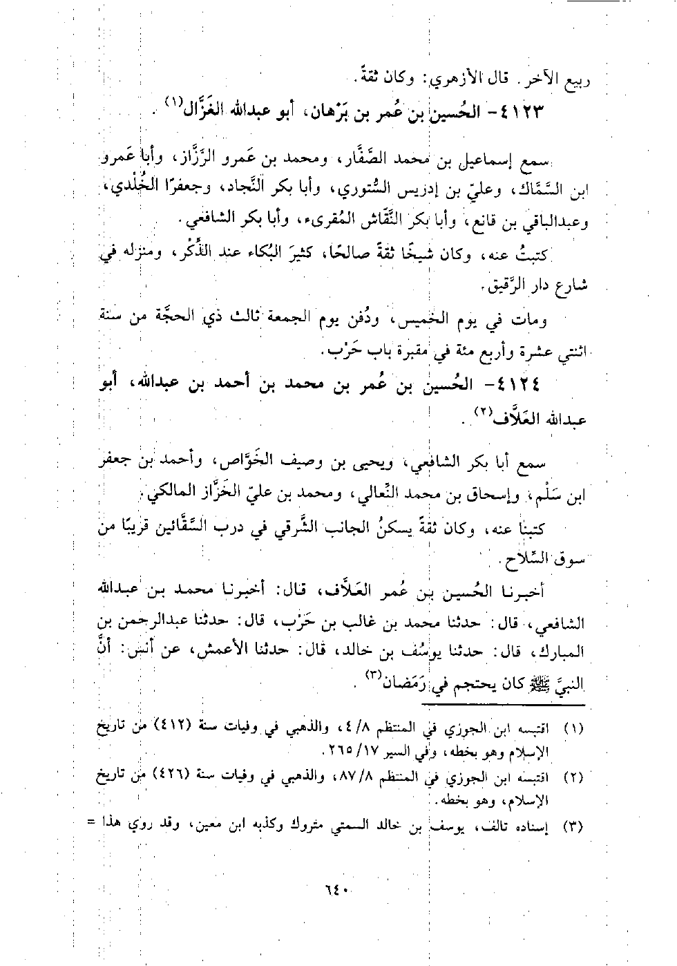 4124 - الْحُسَيْن بْن عُمَرَ بن مُحَمَّدِ بْنِ أَحْمَدَ بْنِ عَبْد اللَّهِ أَبُو عَبْدِ اللَّهِ العلاف سمع أبا بكر الشَّافِعِيّ، ويحيى بن وصيف الخواص، وأحمد بن جَعْفَر بن سلم، وإسحاق بن مُحَمَّد النعالي، ومحمد بن عَلِيّ الخزاز المالكي.