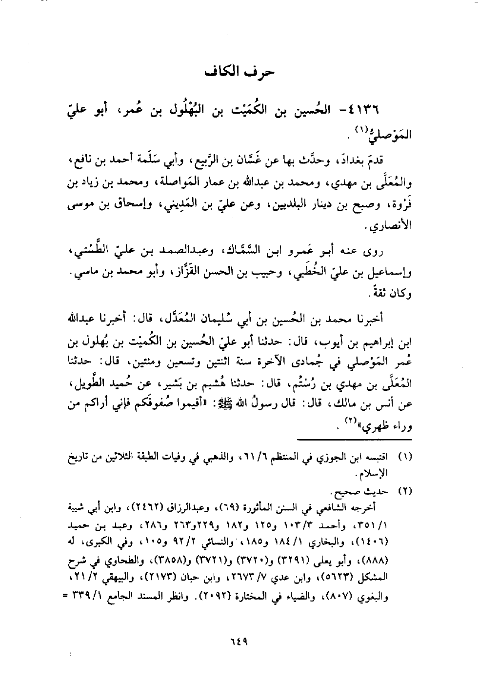 (2631) -[8: 649] أَخْبَرَنَا مُحَمَّدُ بْنُ الْحُسَيْنِ بْنِ أَبِي سُلَيْمَانَ الْمُعَدَّلُ، قَالَ: أَخْبَرَنَا عَبْدُ اللَّهِ بْنُ إِبْرَاهِيمَ بْنِ أَيُّوبَ، قَالَ: حَدَّثَنَا أَبُو عَلِيٍّ الْحُسَيْنُ بْنُ الْكَمِيتِ بْنِ بُهْلُولِ بْنِ عُمَرَ الْمَوْصِلِيُّ فِي جُمَادَى الآخِرَةِ سَنَةَ اثْنَتَيْنِ وَتِسْعِينَ وَمِائَتَيْنِ، قَالَ: حَدَّثَنَا الْمُعَلَّى بْنُ مَهْدِيِّ بْنِ رُسْتُمَ، قَالَ: حَدَّثَنَا هُشَيْمُ بْنُ بَشِيرٍ، عَنْ حُمَيْدٍ الطَّوِيلُ، عَنْ أَنَسِ بْنِ مَالِكٍ، قَالَ: قَالَ رَسُولُ اللَّهِ صَلَّى اللَّهُ عَلَيْهِ وَسَلَّمَ: " أَقِيمُوا صُفُوفَكُمْ فَإِنِّي أَرَاكُمْ مِنْ وَرَاءَ ظَهْرِي " كتب إلي أَبُو الفرج مُحَمَّد بن إدريس بن مُحَمَّد الموصلي، وَحَدَّثَنِي بذلك أَبُو النجيب الأرموي عنه، أن المظفر بن مُحَمَّد الطوسي، حدثهم قَالَ: حَدَّثَنَا أَبُو زكريا يزيد بن مُحَمَّدِ بْنِ إياس الأزدي، قَالَ: انحدر الْحُسَيْن بن كميت إِلَى بَغْدَاد، وكتبوا عنه، وتوفي فِي سنة أربع وتسعين ومائتين.