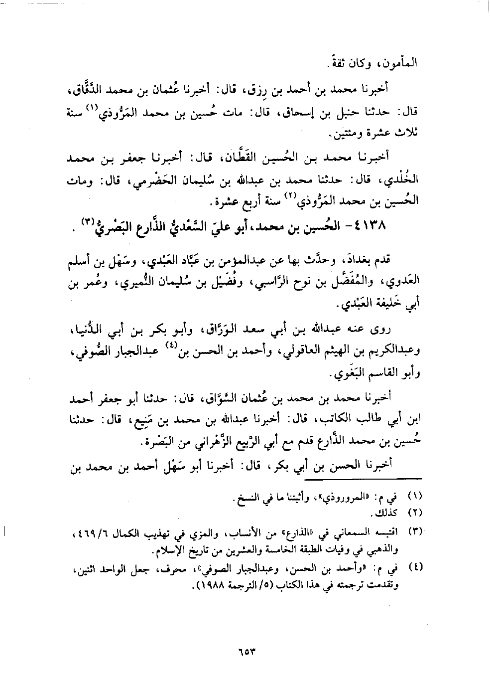 4138 - الْحُسَيْن بن مُحَمَّد أَبُو عَلِيّ السعدي الذارع البصري قدم بَغْدَاد، وحدث بها عَنْ عبد المؤمن بن عباد العبدي، وسهل بن أسلم العدوي، والمفضل بن نوح الراسبي، وفضيل بن سُلَيْمَان النميري، وعمر بن أَبِي خليفة العبدي.