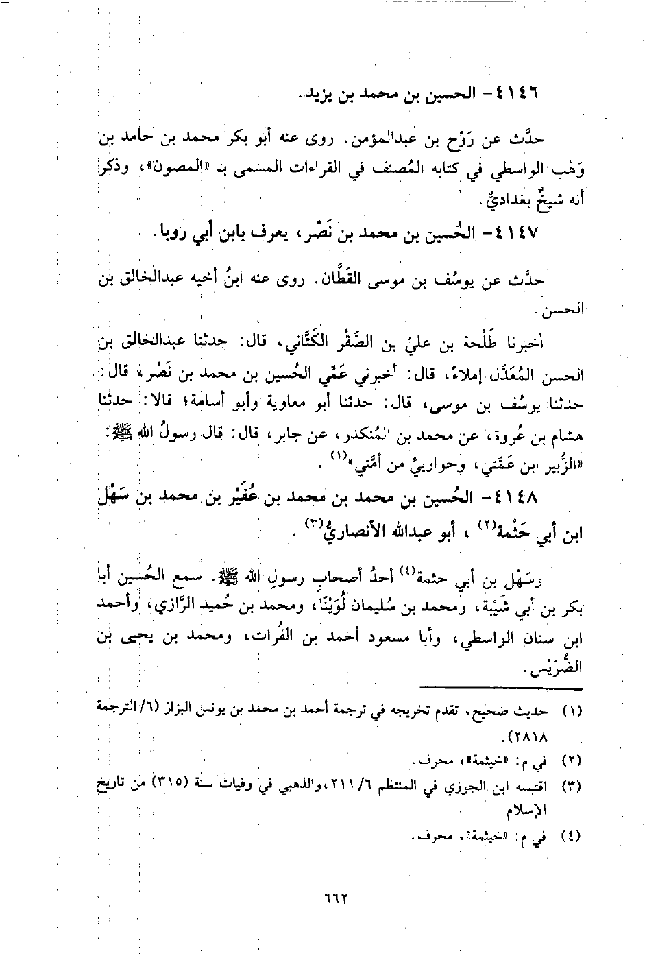 4148 - الْحُسَيْن بن مُحَمَّدِ بْنِ مُحَمَّد بن عفير بن مُحَمَّدِ بْنِ سهل بن أَبِي حثمة أَبُو عَبْدِ اللَّهِ الأنصاري وسهل بن أَبِي حثمة أحد أصحاب رَسُول اللَّهِ صَلَّى اللَّهُ عَلَيْهِ وَسَلَّمَ الْحُسَيْن أبا بكر بن أَبِي شيبة، ومحمد بن سُلَيْمَان لوينا، ومحمد بن حميد الرَّازِيّ، وأحمد بن سنان الواسطي، وأبا مسعود أَحْمَد بن الفرات، ومحمد بن يَحْيَى بن الضريس.