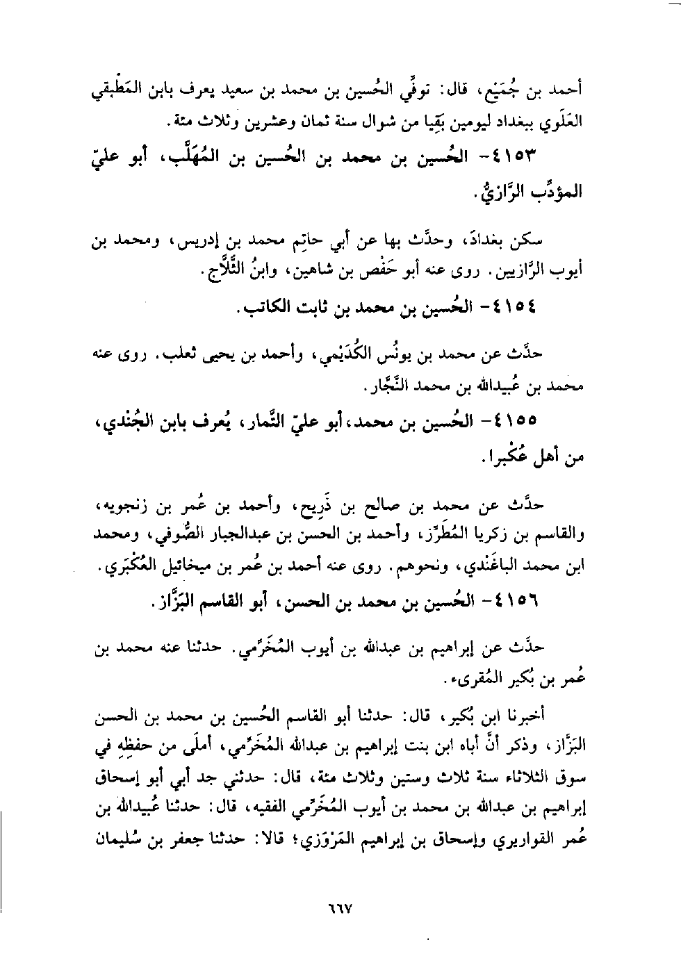 4153 - الْحُسَيْن بن مُحَمَّدِ بْنِ الْحُسَيْن بن المهلب أَبُو عَلِيّ المؤدب الرَّازِيّ سكن بَغْدَاد، وحدث بها عَنْ أَبِي حاتم مُحَمَّد بن إدريس، ومحمد بن أَيُّوبَ الرازيين.