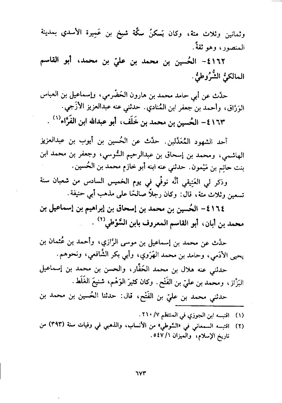 4164 - الْحُسَيْن بن مُحَمَّدِ بْنِ إِسْحَاق بن إِبْرَاهِيم بن إِسْمَاعِيل بن مُحَمَّدِ بْنِ أبان أَبُو الْقَاسِمِ المعروف بابن السوطي حدث عَنْ مُحَمَّد بن إِسْمَاعِيل بن مُوسَى الرَّازِيّ، وأحمد بن عُثْمَان بن يَحْيَى الآدمي، وحامد بن مُحَمَّد الهروي، وأبي بكر الشَّافِعِيّ، ونحوهم حَدَّثَنِي عنه هلال بن مُحَمَّد الحفار، والحسن بن مُحَمَّدِ بْنِ إِسْمَاعِيل الْبَزَّاز، ومحمد بن عَلِيّ بن الفتح.