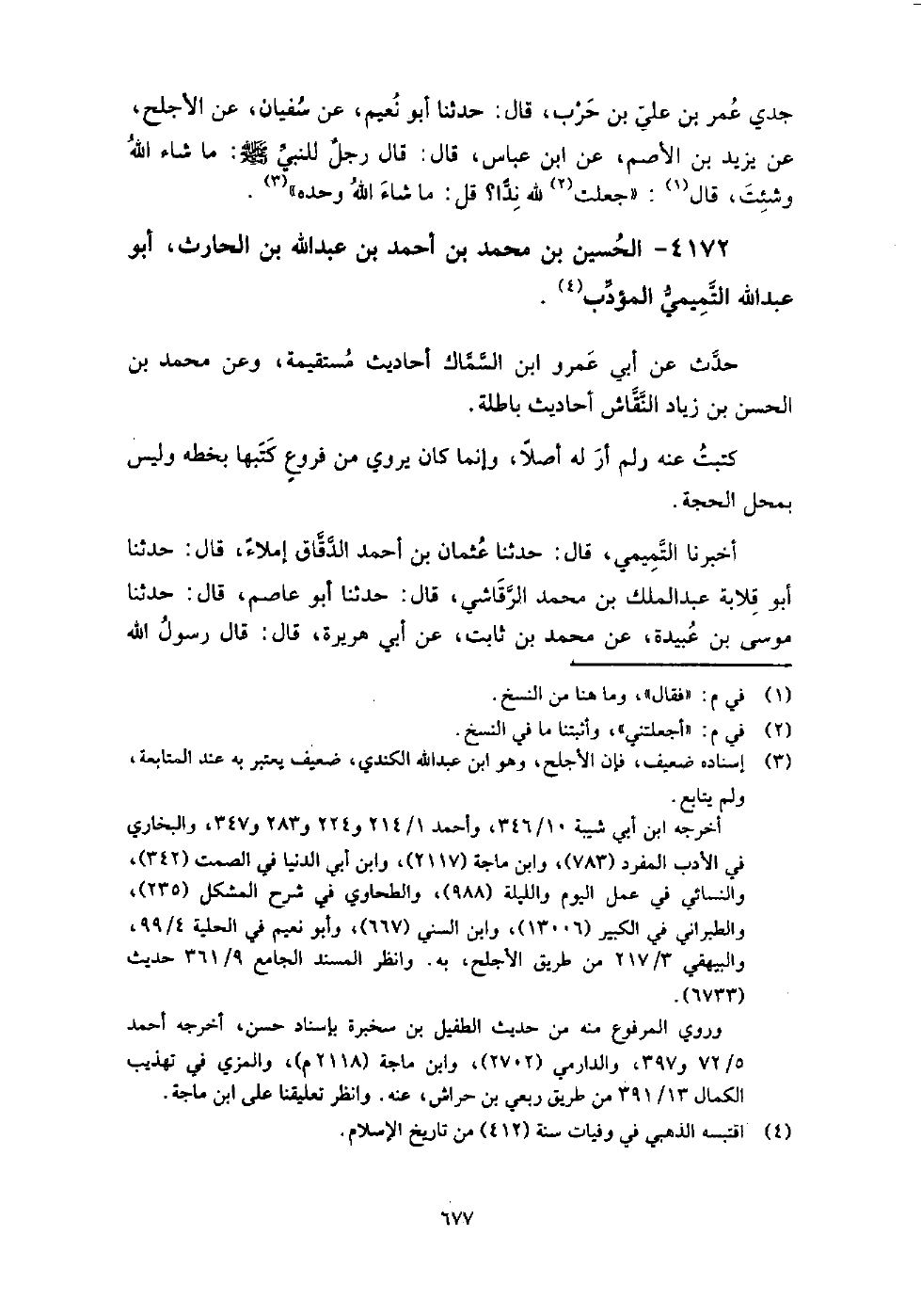 4172 - الْحُسَيْن بن مُحَمَّدِ بْنِ أَحْمَدَ بْنِ عَبْد اللَّهِ بْن الحارث أَبُو عَبْدِ اللَّهِ التميمي المؤدب حدث عَنْ أَبِي عمرو ابن السماك أحاديث مستقيمة، وعن مُحَمَّد بن الْحَسَن بن زياد النقاش أحاديث باطلة.