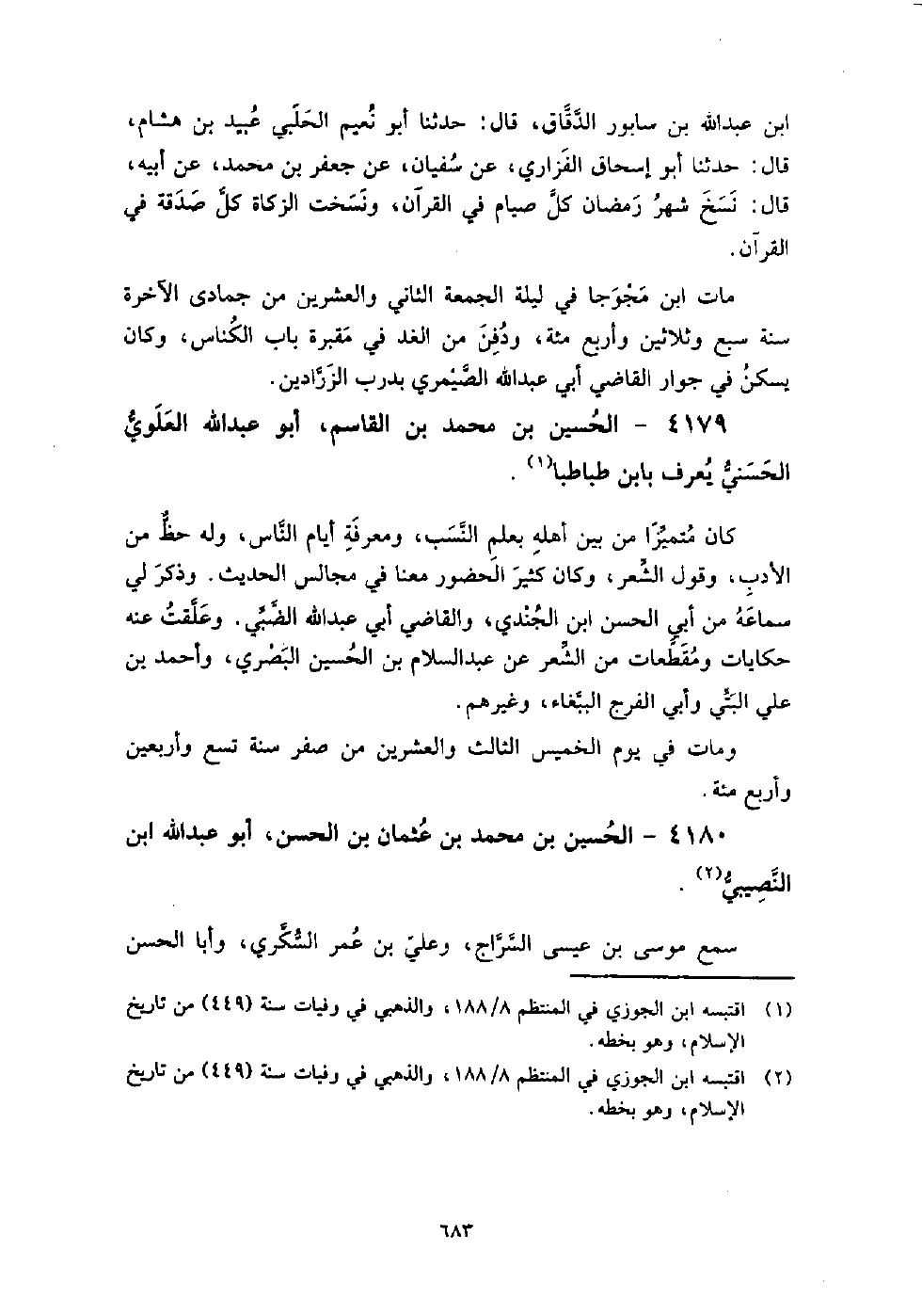 4179 - الْحُسَيْن بن مُحَمَّدِ بْنِ الْقَاسِم أَبُو عَبْدِ اللَّهِ العلوي الحسني يعرف بابن طباطبا كَانَ متميزا من بين أهله بعلم النسب، ومعرفة أيام الناس، وله حظ من الأدب، وقول الشعر، وكان كثير الحضور معنا فِي مجالس الحديث.