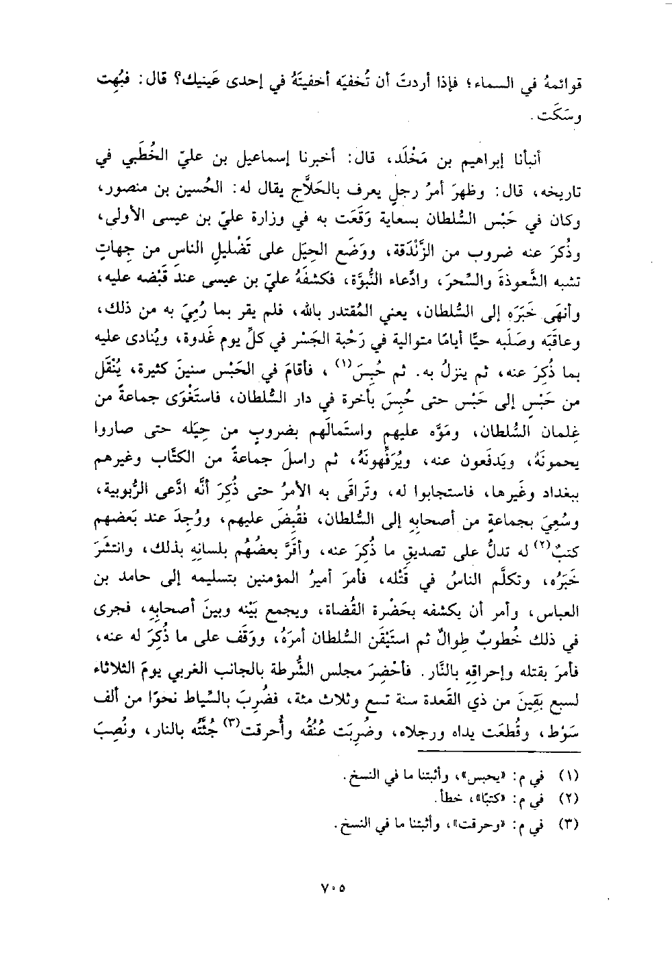 أَنْبَأَنَا إِبْرَاهِيم بن مخلد، قَالَ: أَخْبَرَنَا إِسْمَاعِيل بن عَلِيّ الخطبي فِي تاريخه، قَالَ: وظهر أمر رجل يعرف بالحلاج، يقال لَهُ: الْحُسَيْن بن مَنْصُور وكان فِي حبس السلطان بسعاية وقعت به فِي وزارة عَلِيّ بن عِيسَى الأولى، وذكر عنه ضروب من الزندقة، ووضع الحيل عَلَى تضليل الناس من جهات تشبه الشعوذة والسحر، وادعاء النبوة، فكشفه عَلِيّ بن عِيسَى عند قبضه عليه، وأنهى خبره إِلَى السلطان، يعني المقتدر بالله، فلم يقر بما رمي به من ذلك، وعاقبه، وصلبه حيا أياما متوالية فِي رحبة الجسر فِي كل يوم غدوة، وينادى عليه بما ذكر عنه، ثم ينزل به.