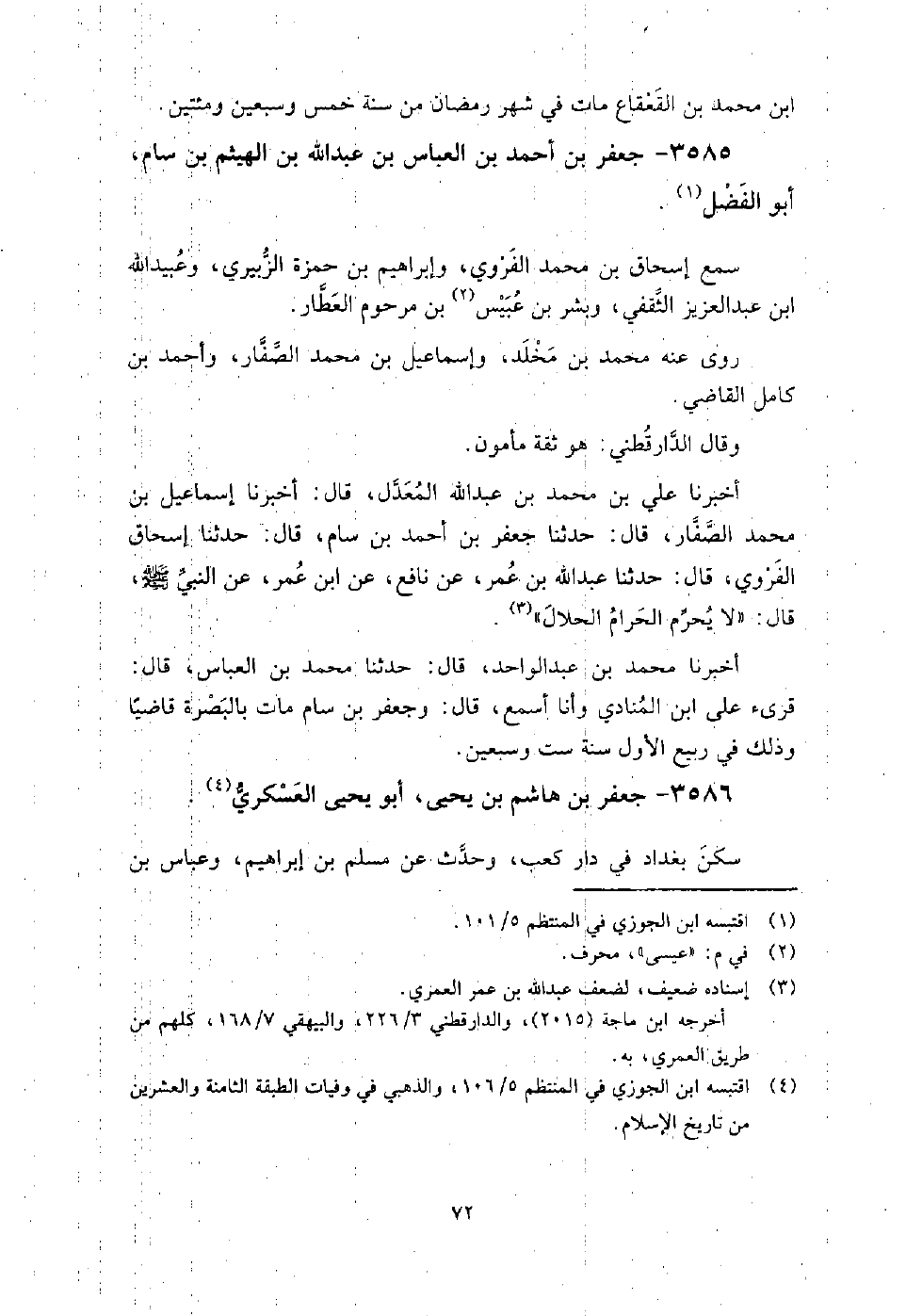 3585 - جَعْفَر بن أَحْمَدَ بْنِ العباس بن عَبْدِ اللَّهِ بْنِ الهيثم بن سام، أَبُو الفضل سمع إِسْحَاق بن مُحَمَّد الفروي، وإبراهيم بن حمزة الزبيري، وعبيد الله بن عبد العزيز الثقفي، وبشر بن عُبَيْس بن مرحوم العطار.