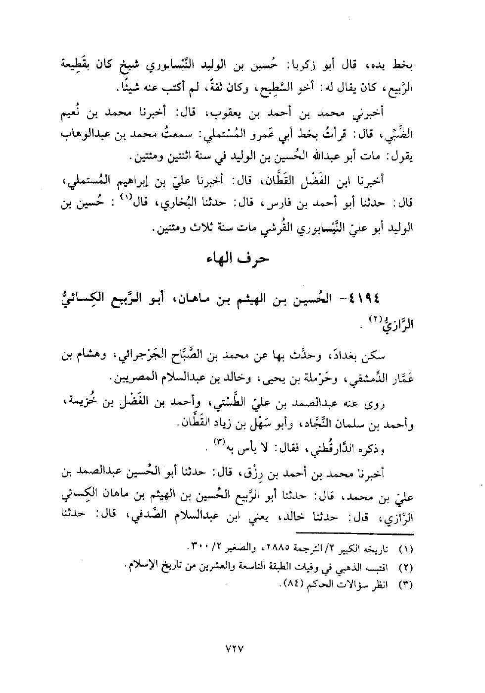 4194 - الْحُسَيْن بن الهيثم بن ماهان أَبُو الربيع الكسائي الرَّازِيّ سكن بَغْدَاد، وحدث بها عَنْ مُحَمَّد بن الصباح الجرجرائي، وهشام بن عمار الدمشقي، وحرملة بن يَحْيَى، وخالد بن عبد السلام المصريين.