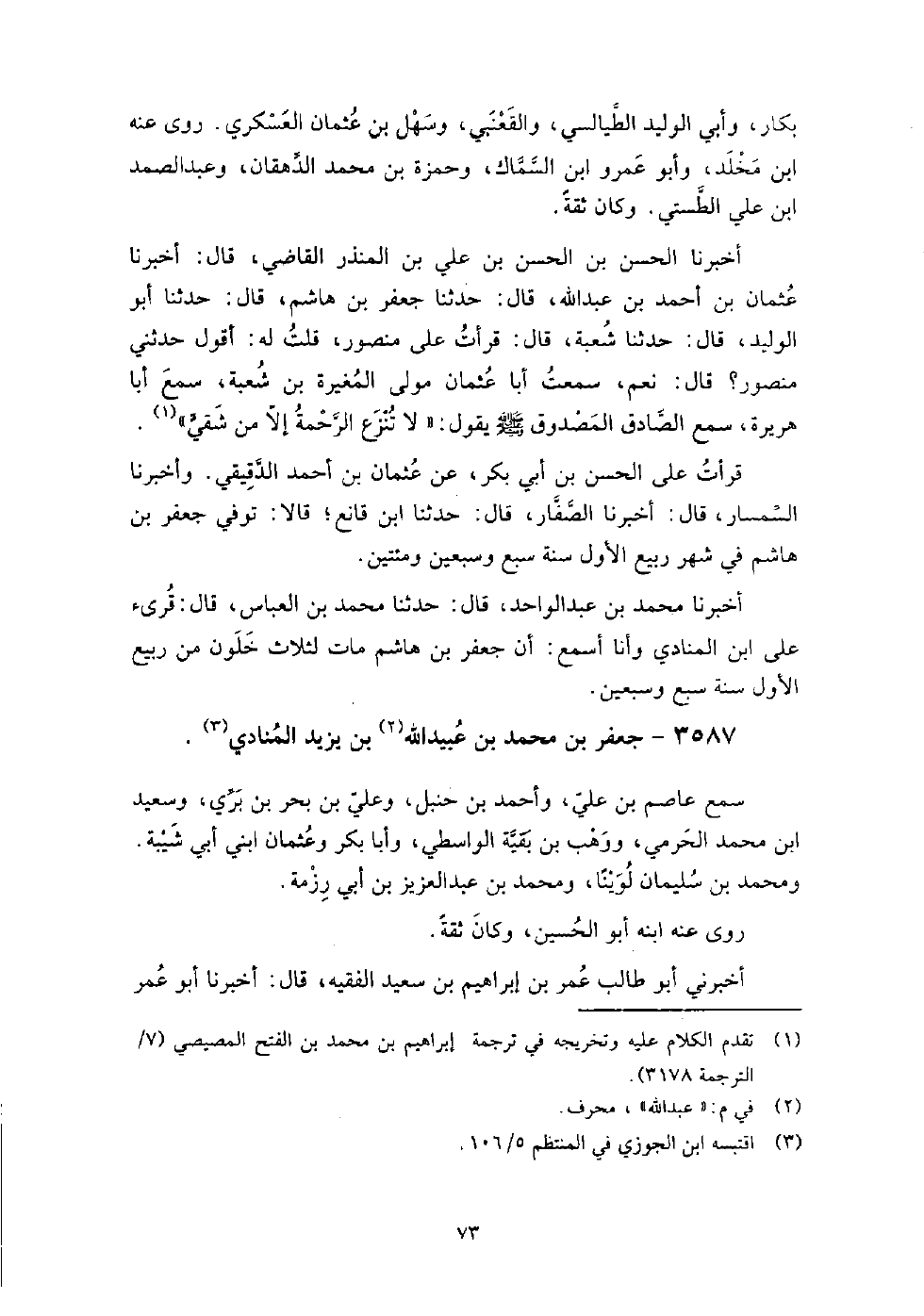 3587 - جَعْفَر بن مُحَمَّدِ بْنِ عبيد الله بن يزيد المنادي سمع عاصم بن عَلِيّ، وأحمد بن حنبل، وعلي بن بحر بن بري، وسعيد بن مُحَمَّد الحرمي، ووهب بن بقية الواسطي، وأبا بكر وعثمان ابني أبي شيبة، ومحمد بن سُلَيْمَان لُوَيْنًا، ومحمد بن عبد العزيز أبي رزمة.