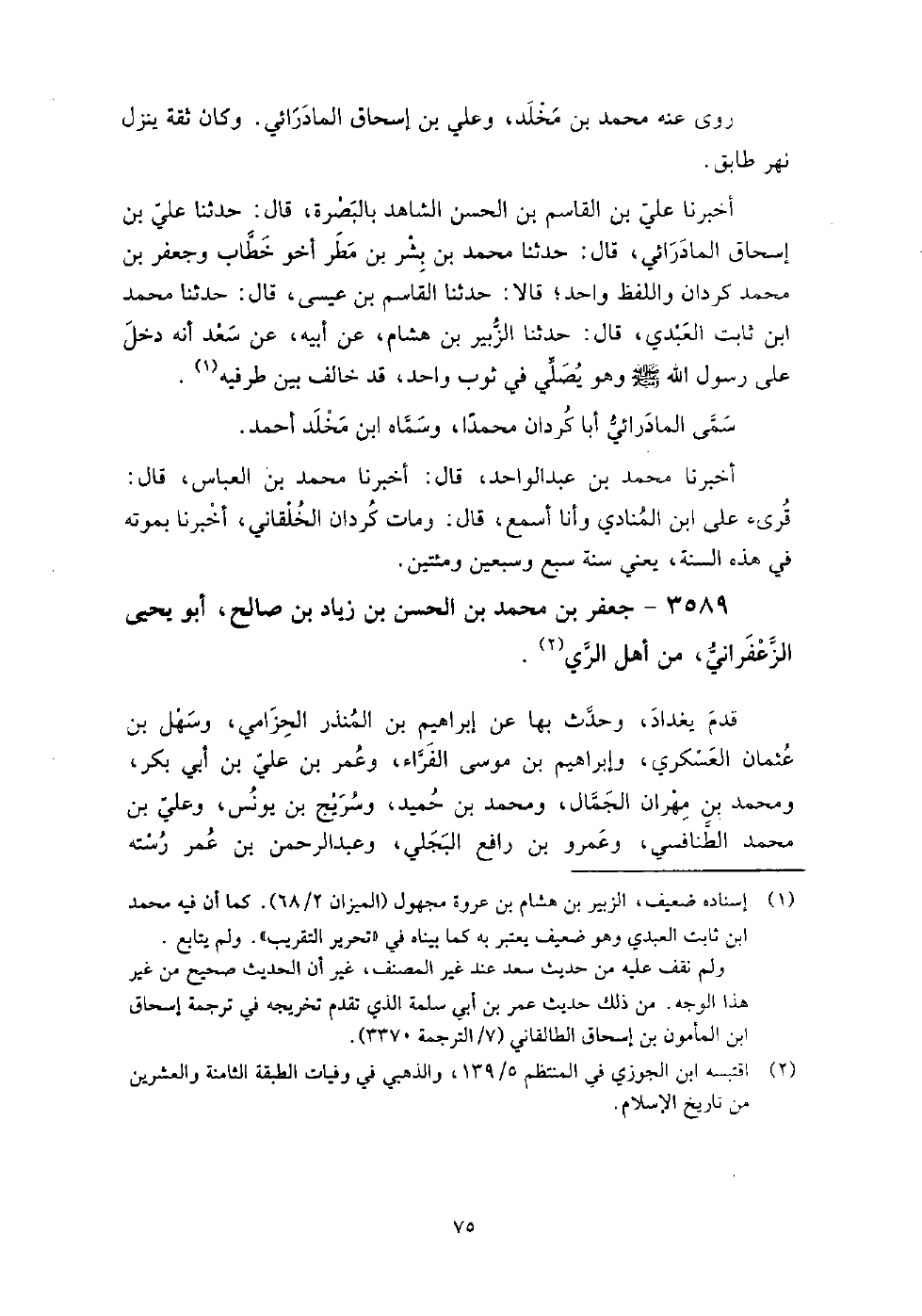 3589 - جَعْفَر بن مُحَمَّدِ بْنِ الْحَسَن بن زياد بن صالح، أَبُو يَحْيَى الزعفراني، من أهل الري قدم بغداد، وحدث بها عَنْ إِبْرَاهِيم بن المنذر الحزامي، وسهل بن عُثْمَان العسكري، وإبراهيم بن مُوسَى الفراء، وعمر بن عَلِيّ بن أبي بكر، ومحمد بن مهران الجمال، ومحمد بن حميد، وسريج بن يونس، وعلي بن مُحَمَّد الطنافسي، وعمرو بن رافع البجلي، وعَبْد الرَّحْمَنِ بن عُمَر رسته، وغيرهم.