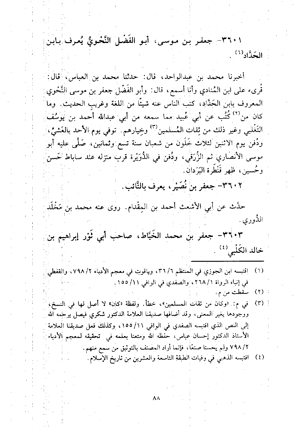 3601 - جَعْفَر بن مُوسَى أَبُو الفضل النحوي يعرف بابن الحداد أخبرنا مُحَمَّد بن عبد الواحد، قَالَ: حَدَّثَنَا مُحَمَّدُ بْنُ الْعَبَّاس، قَالَ: قرئ عَلَى ابن الْمُنَادِي، وأنا أسمع، قَالَ: وأبو الفضل جَعْفَر بن مُوسَى النحوي المعروف بابن الحداد، كتب الناس عنه شيئا من اللغة وغريب الحديث.