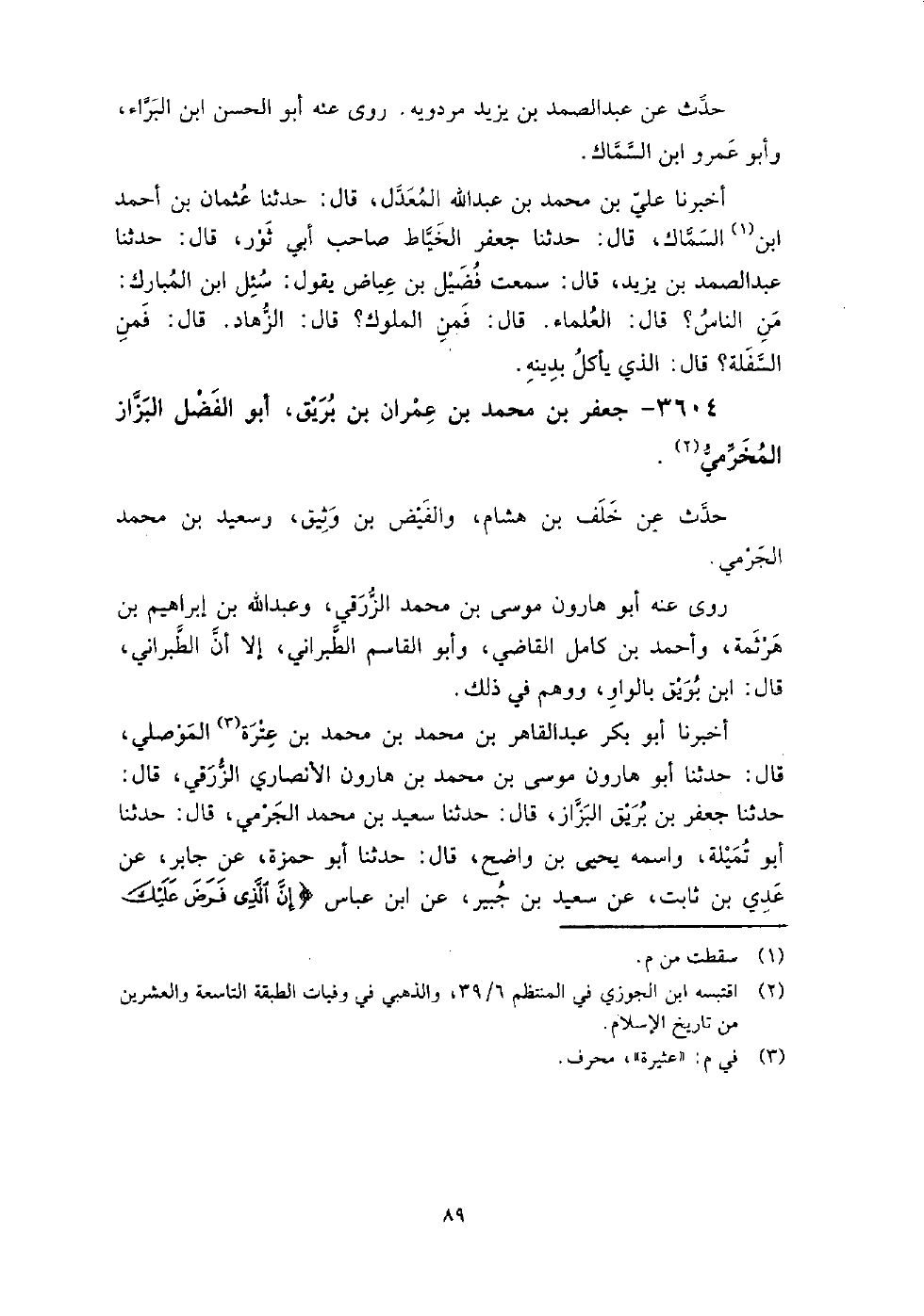 (2333) أَخْبَرَنَا أَبُو بَكْرٍ عَبْدُ الْقَاهِرِ بْنُ مُحَمَّدِ بْنِ مُحَمَّدِ بْنِ عَتْرَةَ الْمَوْصِلِيُّ، قَالَ: حَدَّثَنَا أَبُو هَارُونَ مُوسَى بْنُ مُحَمَّدِ بْنِ هَارُونَ الأَنْصَارِيُّ الزُّرَقِيُّ، قَالَ: حَدَّثَنَا جَعْفَرُ بْنُ بُرَيْقٍ الْبَزَّازُ، قَالَ: حَدَّثَنَا سَعِيدُ بْنُ مُحَمَّدٍ الْجَرْمِيُّ، قَالَ: حَدَّثَنَا أَبُو تُمَيْلَةَ وَاسْمُهُ يَحْيَى بْنُ وَاضِحٍ، قَالَ: حَدَّثَنَا أَبُو حَمْزَةَ، عَنْ جَابِرٍ، عَنْ عَدِيِّ بْنِ ثَابِتٍ، عَنْ سَعِيدِ بْنِ جُبَيْرٍ، عَنِ ابْنِ عَبَّاسٍف إِنَّ الَّذِي فَرَضَ عَلَيْكَ الْقُرْءَانَ لَرَادُّكَ إِلَى مَعَادٍق، قَالَ: إِلَى الْمَوْتِ أَوْ إِلَى مَكَّةَ حَدَّثَنَا مُحَمَّدُ بْنُ عبد الواحد، قَالَ: أخبرنا مُحَمَّد بن الْعَبَّاس، قَالَ: قرئ عَلَى ابن الْمُنَادِي، وأنا أسمع، قَالَ: وجعفر بن مُحَمَّدِ بْنِ عمران البزاز المعروف بابن بريق توفي يوم الخميس لأيام بقيت من صفر سنة تسعين، كان قد حدث قبل موته بقليل، ومات عَلَى ستر جميل.