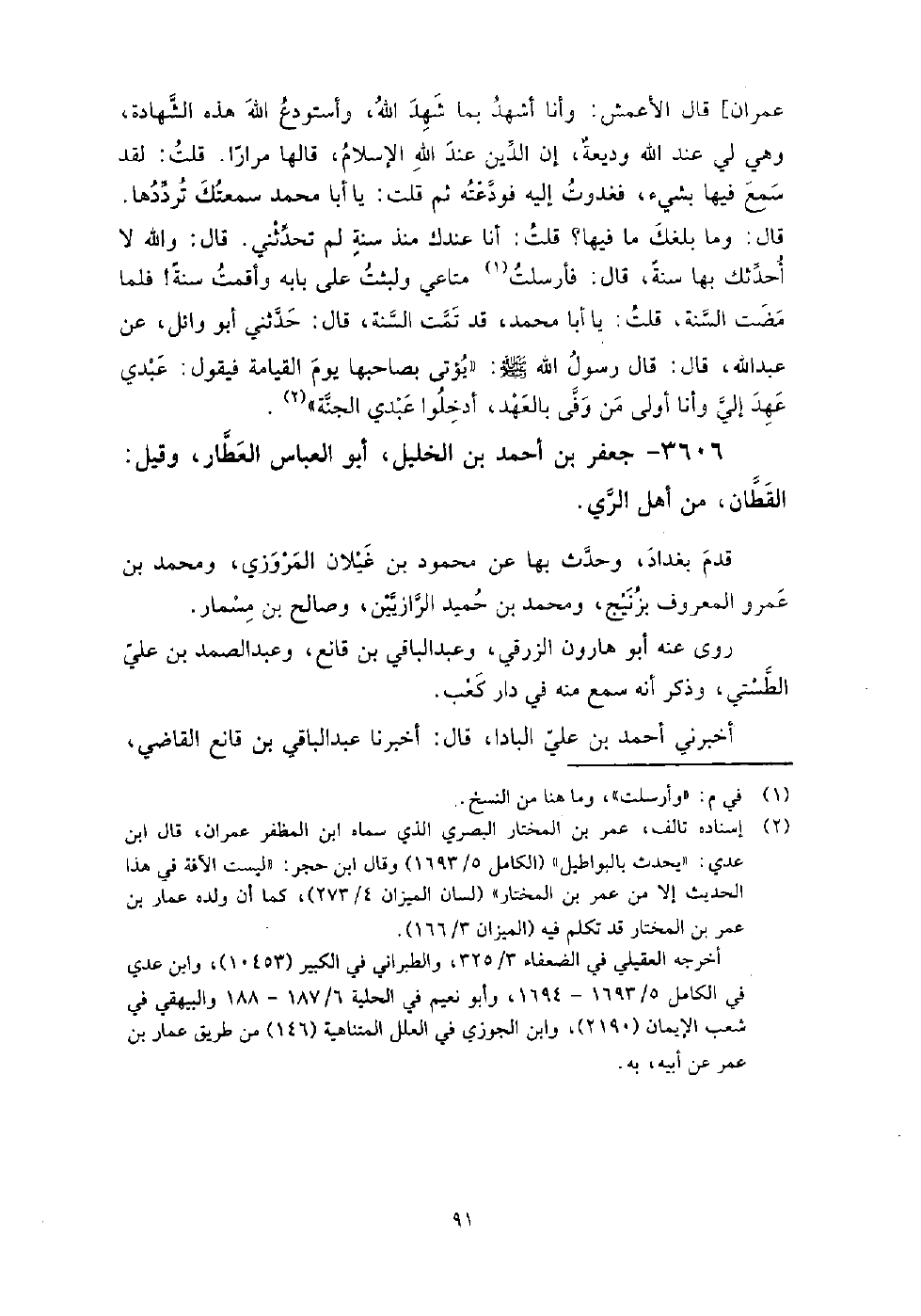 3606 - جَعْفَر بن أَحْمَدَ بْنِ الخليل أَبُو الْعَبَّاس العطار، وقيل القطان من أهل الري قدم بغداد، وحدث بها عَنْ محمود بن غيلان المروزي، ومحمد بن عمرو المعروف بزنيج، ومحمد بن حميد الرازيين، وصالح بن مسمار.