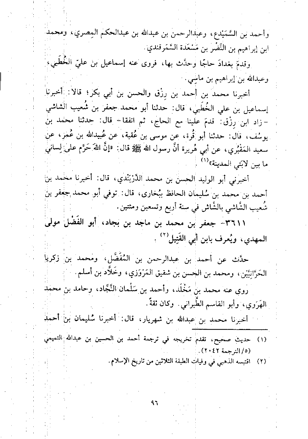 3611 - جَعْفَر بن مُحَمَّدِ بْنِ ماجد بن بجاد، أَبُو الفضل مولى المهدي، ويعرف بابن أبي القتيل حدث عَنْ أَحْمَد بن عَبْد الرَّحْمَنِ بن المفضل، ومحمد بن زكريا الحرانيين، ومحمد بن الْحَسَن بن شقيق المروزي، وخلاد بن أسلم.