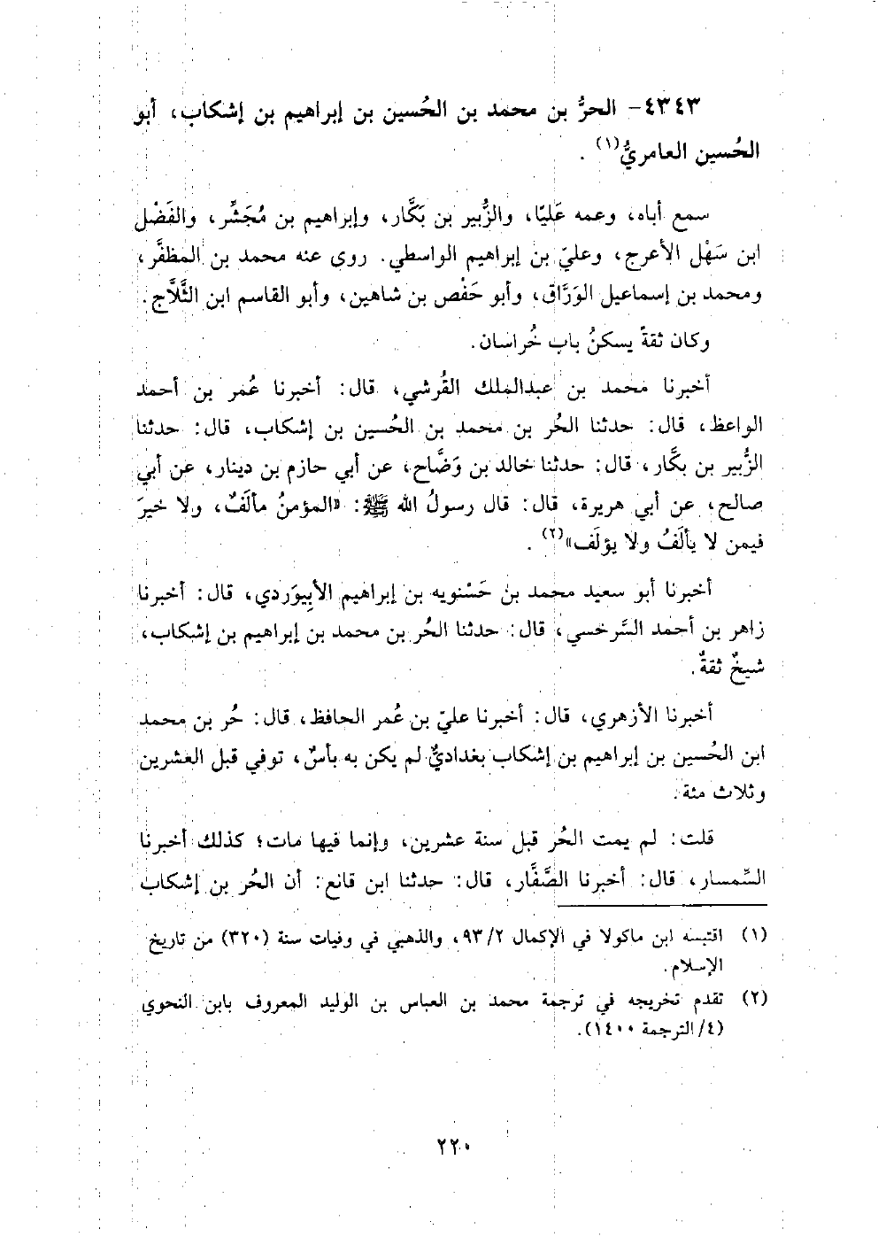 (2775) -[9: 220] أخبرنا مُحَمَّدُ بْنُ عَبْدِ الْمَلِكِ الْقُرَشِيُّ، قَالَ: أخبرنا عُمَرُ بْنُ أَحْمَدَ الْوَاعِظُ، قَالَ: حَدَّثَنَا الْحُرُّ بْنُ مُحَمَّدِ بْنِ الْحُسَيْنِ بْنِ إشْكَابَ، قَالَ: حَدَّثَنَا الزُّبَيْرُ بْنُ بَكَّارٍ، قَالَ: حَدَّثَنَا خَالِدُ بْنُ وَضَّاحٍ، عَنْ أَبِي حَازِمِ بْنِ دِينَارٍ، عَنْ أَبِي صَالِحٍ، عَنْ أَبِي هُرَيْرَةَ، قَالَ: قَالَ رَسُولُ اللَّهِ صَلَّى اللَّهُ عَلَيْهِ وَسَلَّمَ: " الْمُؤْمِنُ مَأْلَفٌ، وَلا خَيْرَ فِيمَنْ لا يَأْلَفُ وَلا يُؤْلَفُ " أخبرنا أَبُو سعيد مُحَمَّد بْن حسنويه بْن إِبْرَاهِيمَ الأبيوردي، قَالَ: أخبرنا زاهر بْن أَحْمَد السرخسي، قَالَ: حَدَّثَنَا الحر بْن مُحَمَّد بْن إِبْرَاهِيمَ بْن إشكاب، شيخ ثقة أخبرنا الأزهري، قَالَ: أخبرنا علي بْن عُمَر الْحَافِظ، قَالَ: حر بْن مُحَمَّد بْن الْحُسَيْن بْن إِبْرَاهِيمَ بْن إشكاب بغدادي لم يكن به بأس، توفي قبل العشرين وَثلاث مائة قلت: لم يمت الحر قبل سنة عشرين، وَإنما فيها مات، كذلك أخبرنا السمسار، قَالَ: أخبرنا الصفار، قَالَ: حَدَّثَنَا ابْن قانع أن الحر بْن إشكاب مات فِي ذي القعدة من سنة عشرين وَثلاث مائة.