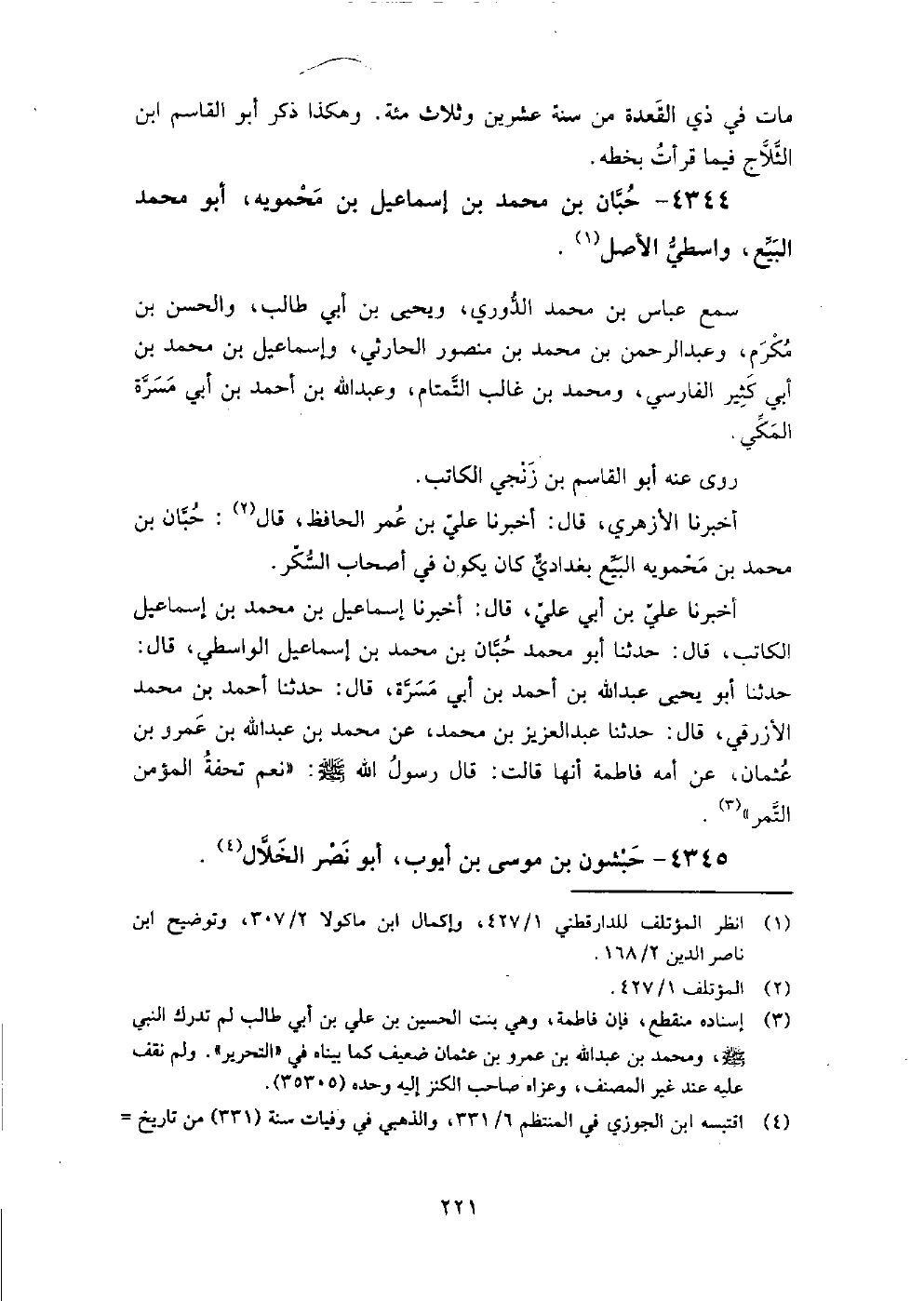 4345 - حبشون بْن مُوسَى بْن أيوب أَبُو نصر الخلال سمع علي بْن سعيد بْن قتيبة الرملي، وَالحسن بْن عرفة العبدي، وَعلي بْن عَمْرو الأنصاري، وَعلي بْن الْحُسَيْن بْن إشكاب، وَعبد اللَّه بْن أيوب المخرمي، وَسلمان بْن توبة النهرواني، وَحنبل بْن إسحاق الشيباني.