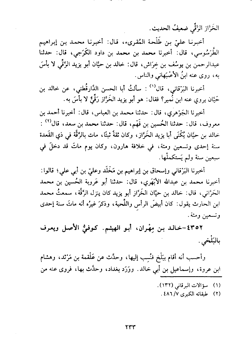 4352 - خَالِد بْن مهران أَبُو الهيثم كوفي الأصل وَيعرف بالبلخي وأحسب أنه أقام ببلخ فنسب إليها، وَحدث عَنْ علقمة بْن مرثد، وَهشام بْن عروة، وَإسماعيل بْن أَبِي خَالِد، وَورد بَغْدَاد، وَحدث بها، فروى عنه من أهلها إِبْرَاهِيم بْن عَبْد اللَّهِ المعروف بالهروي.