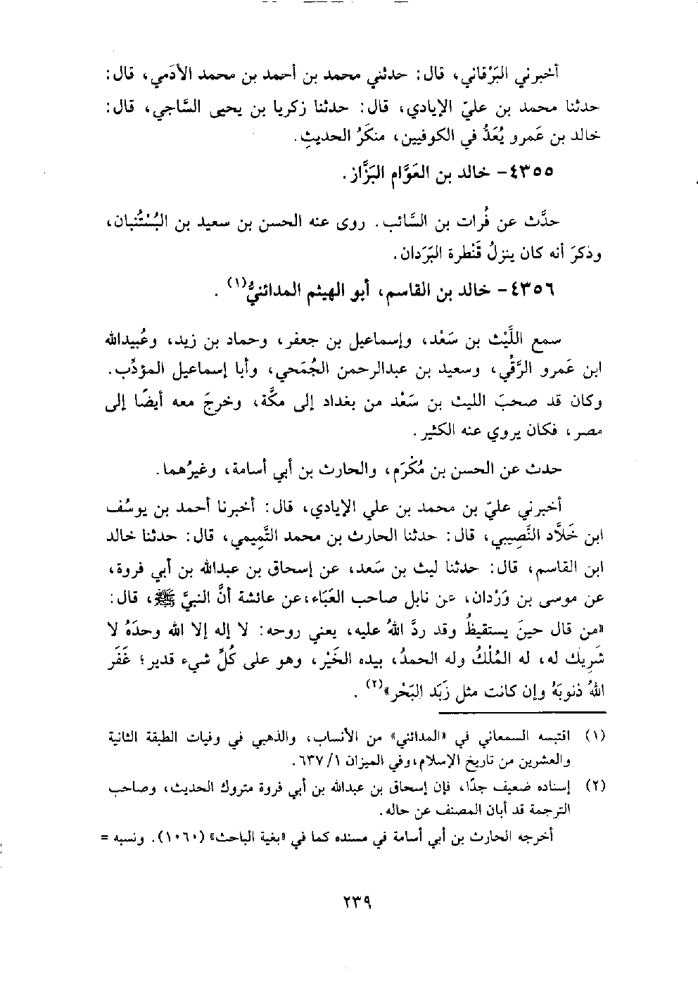 (2786) -[9: 239] أَخْبَرَنِي عَلِيُّ بْنُ مُحَمَّدِ بْنِ عَلِيٍّ الإِيَادِيُّ، قَالَ: أخبرنا أَحْمَدُ بْنُ يُوسُفَ بْنِ خَلادٍ النَّصِيبِيُّ، قَالَ: حَدَّثَنَا الْحَارِثُ بْنُ مُحَمَّدٍ التَّمِيمِيُّ، قَالَ: حَدَّثَنَا خَالِدُ بْنُ الْقَاسِمِ، قَالَ: حَدَّثَنَا لَيْثُ بْنُ سَعْدٍ، عَنْ إِسْحَاقَ بْنِ عَبْدِ اللَّهِ بْنِ أَبِي فَرْوَةَ، عَنْ مُوسَى بْنِ وَرْدَانَ، عَنْ نَابِلٍ صَاحِبِ الْعَبَاءِ، عَنْ عَائِشَةَ، أَنَّ النَّبِيَّ صَلَّى اللَّهُ عَلَيْهِ وَسَلَّمَ قَالَ: " مَنْ قَالَ حِينَ يَسْتَيْقِظُ وَقَدْ رَدَّ اللَّهُ عَلَيْهِ، يَعْنِي رُوحَهُ: لا إِلَهَ إِلا اللَّهُ وَحْدَهُ لا شَرِيكَ لَهُ، لَهُ الْمُلْكُ وَلَهُ الْحَمْدُ، بِيَدِهِ الْخَيْرُ وَهُوَ عَلَى كُلِّ شَيْءٍ قَدِيرٌ، غَفَرَ اللَّهُ ذُنُوبَهُ وَإِنْ كَانَتْ مِثْلَ زَبَدِ الْبَحْرِ " أخبرنا مُحَمَّد بْن أَحْمَد بْن رزق، وَمحمد بْن الْحُسَيْن بْن الفضل، قَالَ: أخبرنا دعلج بْن أَحْمَد، قَالَ: أخبرنا، وَفي حَدِيث ابْن رزق: حَدَّثَنَا أَحْمَد بْن علي الأبار، قَالَ: حَدَّثَنَا مؤمل أَبُو عَبْد الرَّحْمَنِ، قَالَ: سمعت أبا نعيم، يقول: كَانَ خَالِد المدائني يلزق أحاديث الليث، إذا كَانَ عَنِ الزُّهْرِيِّ عَنِ ابْن عُمَر أدخل سالما، وَإذا كَانَ عَنِ الزُّهْرِيِّ عَنْ عائشة أدخل، عروة، فقلت له: اتق اللَّه، فَقَالَ: وَيجيء أحد يعرف هذا؟ وَقَالَ الأبار حَدَّثَنِي مجاهد بْن مُوسَى، قَالَ: أتيت خالدا المدائني بشفاعة فَقَالَ لي: أي شيء تريد؟، قلت: حَدِيث الليث بْن سَعْد، عَنْ يزيد بْن أَبِي حبيب، فأخرجه فأعطاني، فجعلت أكتب على الولاء، وَكنا أربعة فَقَالُوا لي: انتخب، فقلت لا، إِلا على الولاء، فتركوني، فكتبت ثُمَّ أعطيته يقرأ وَيسند لي، فقلت: ليس هذا فِي الكتاب، فَقَالَ: اكتب كما أقول لك، فقلت: جزاك اللَّه خيرا، وَظننت أنه تركها عمدا حتى تبينت بعد ذلك.